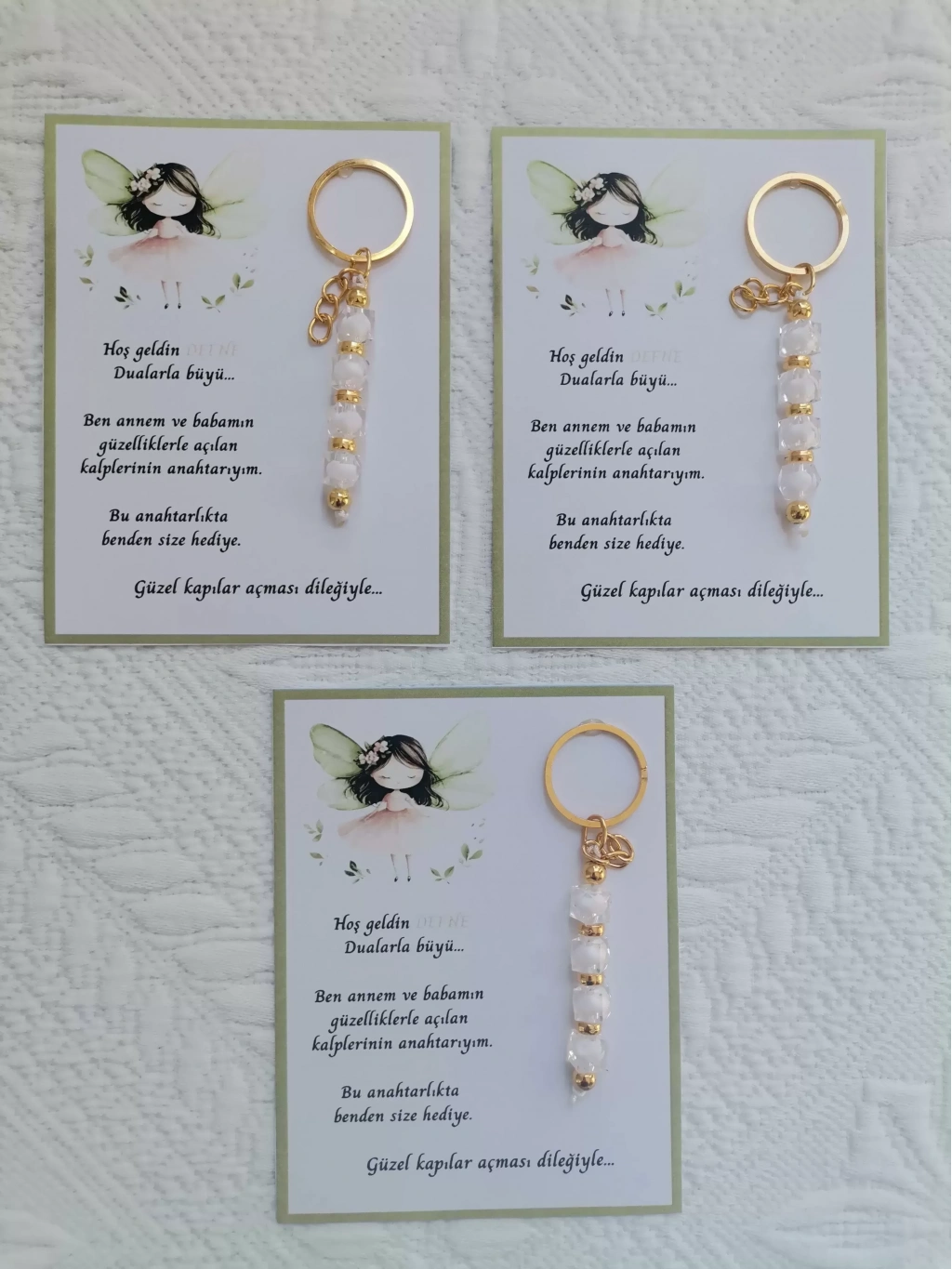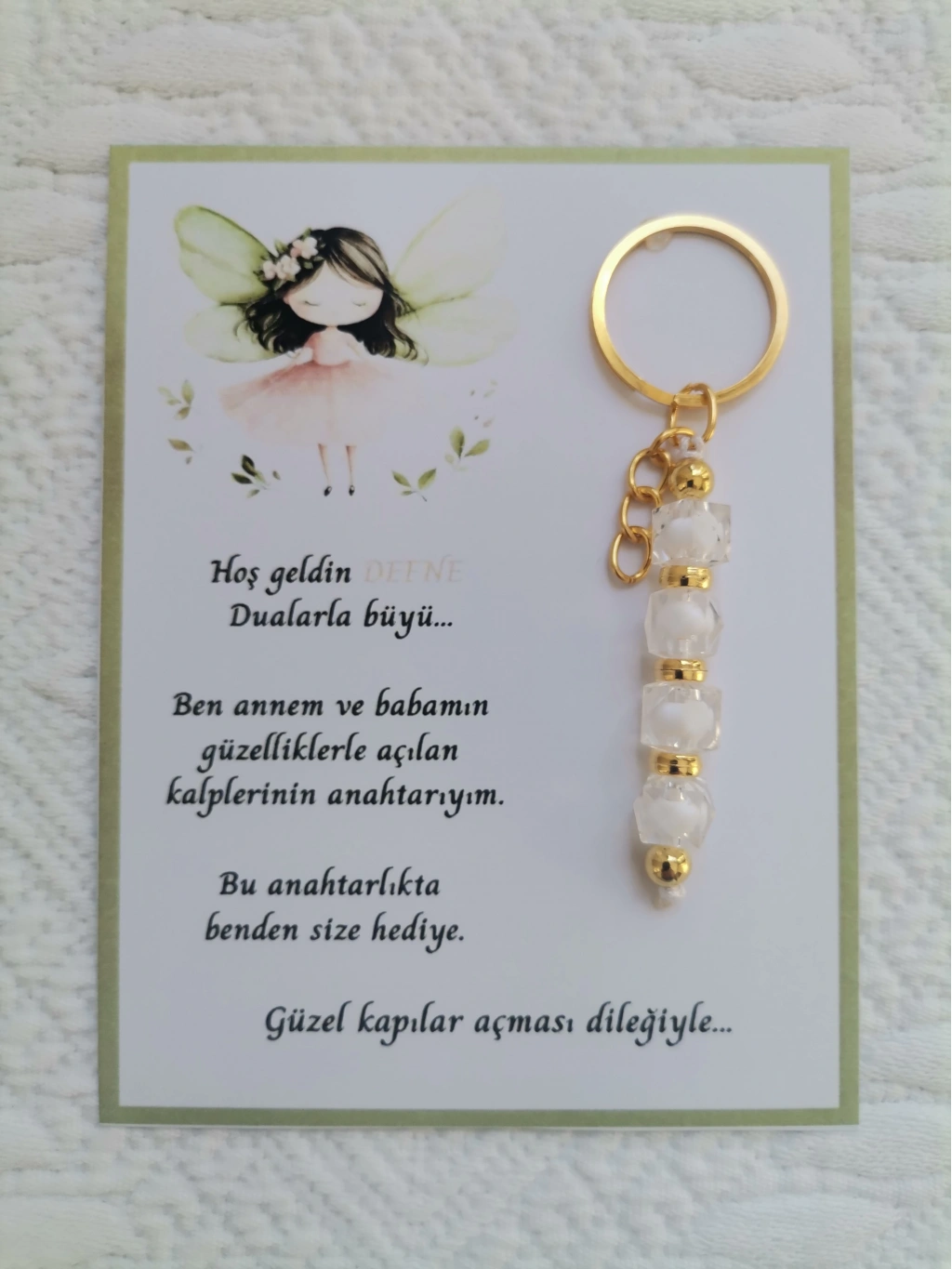 100 adet BEYAZ anahtarlık, dualarla büyülü mesajlarla süslenmiş, hastane ve yeni doğan bebeklerinize özel olarak tasarlanmıştır.