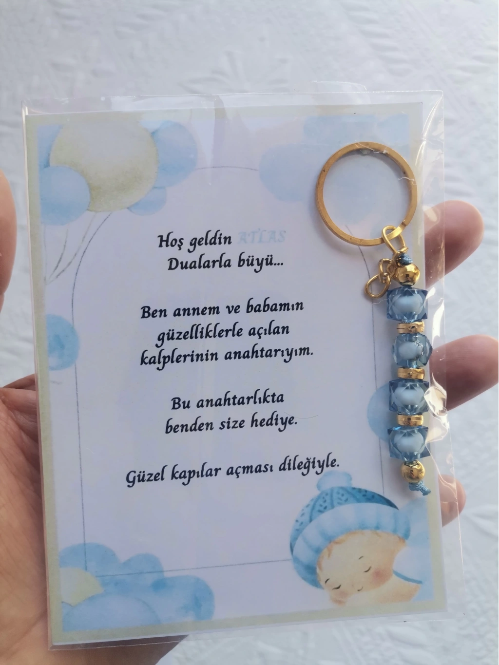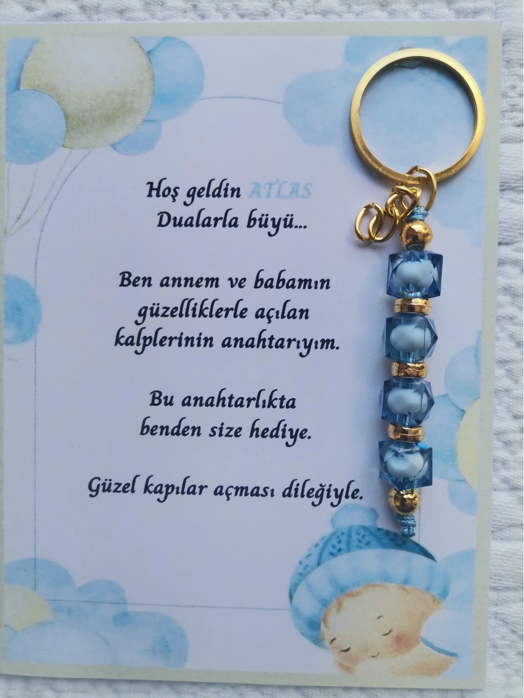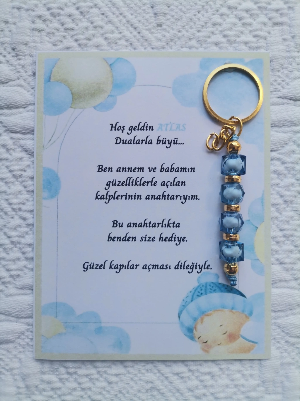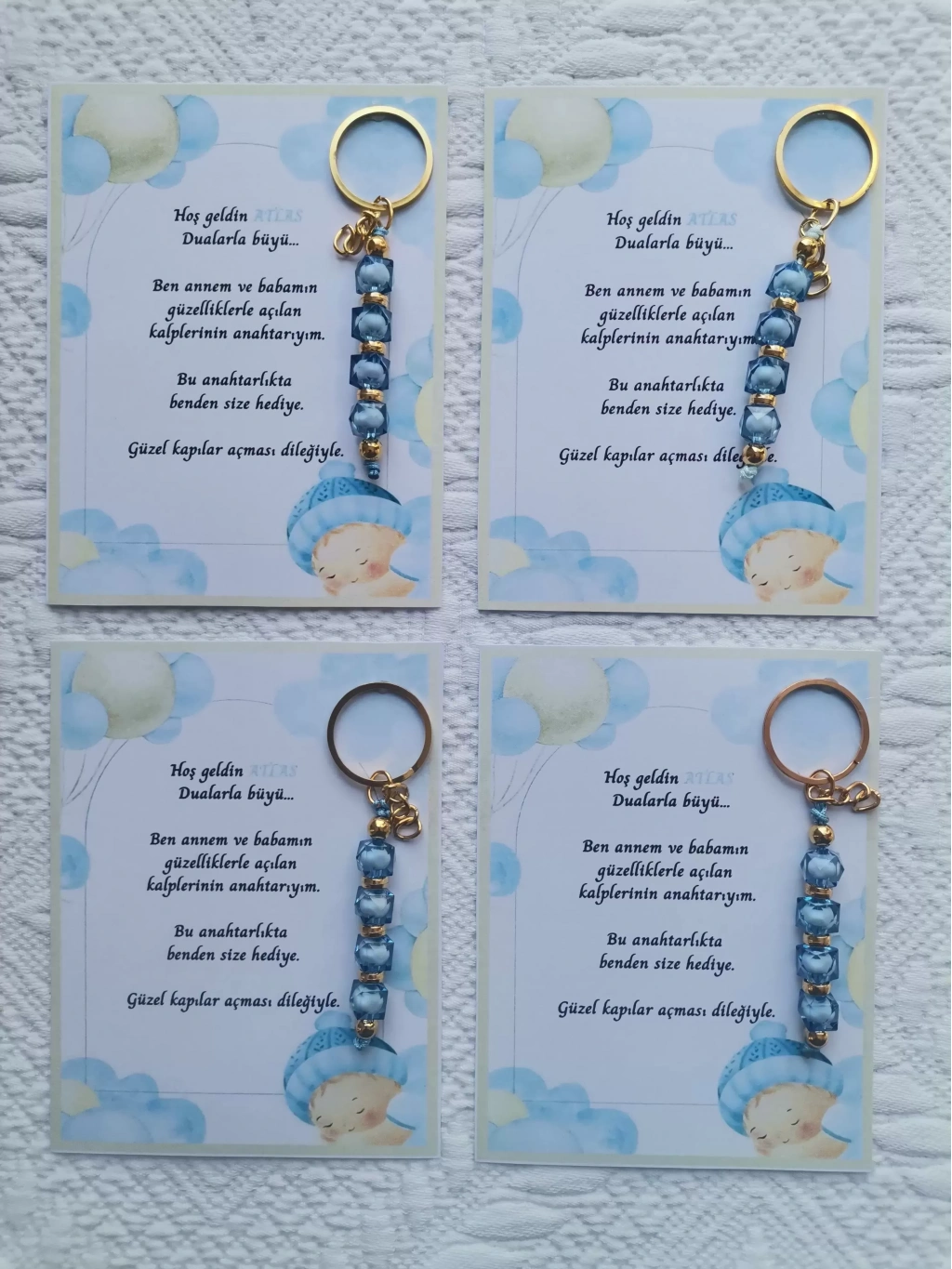 100 adet MAVİ anahtarlık, dualarla büyülü mesajlarla süslenmiş, hastane ve yeni doğan bebeklerinize özel olarak tasarlanmıştır.