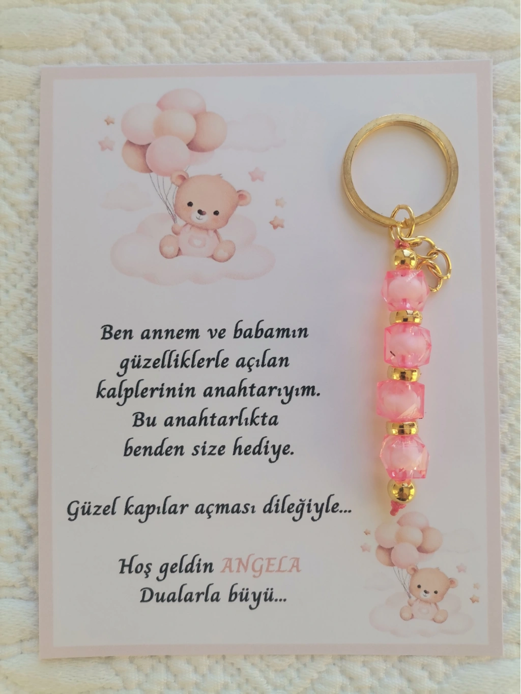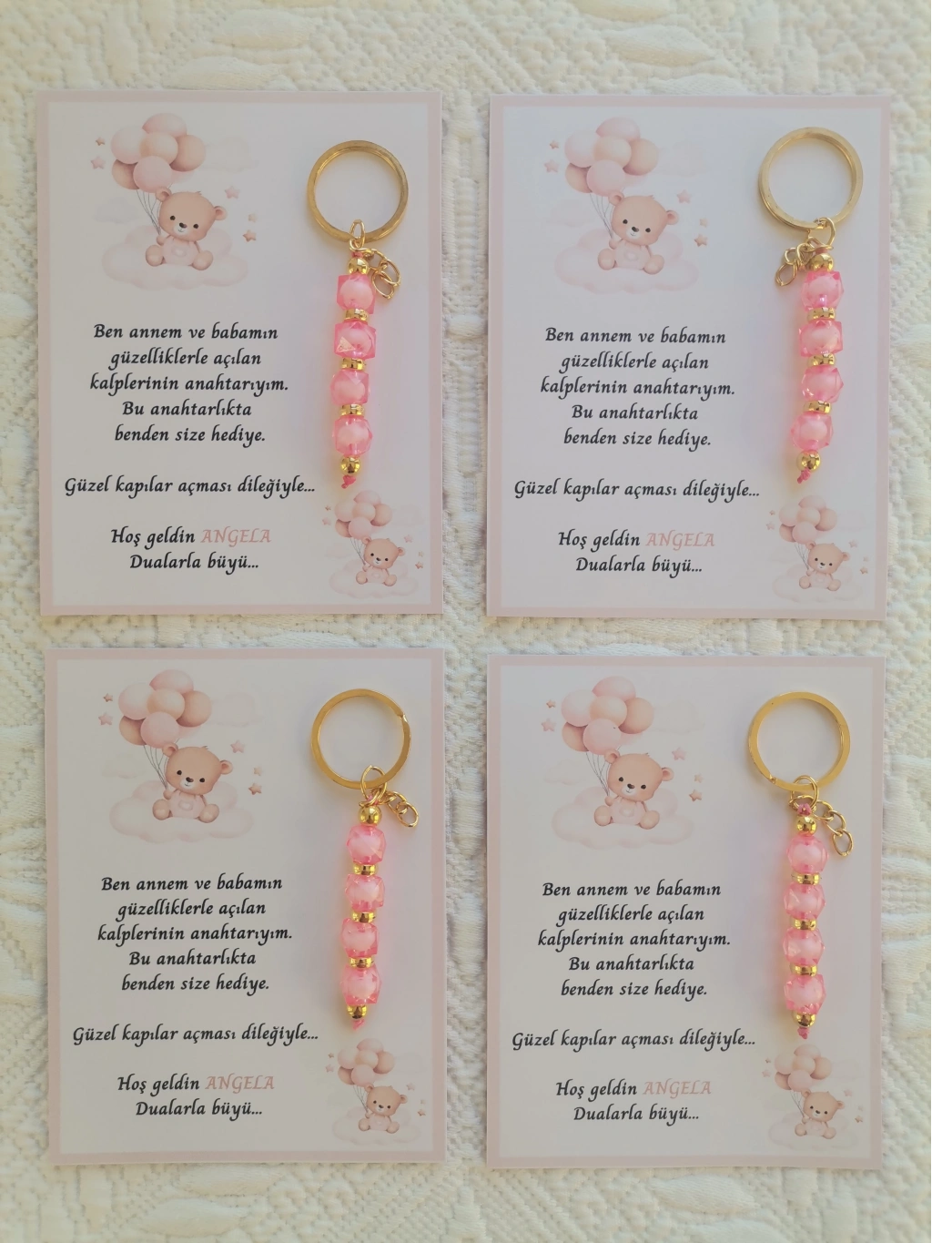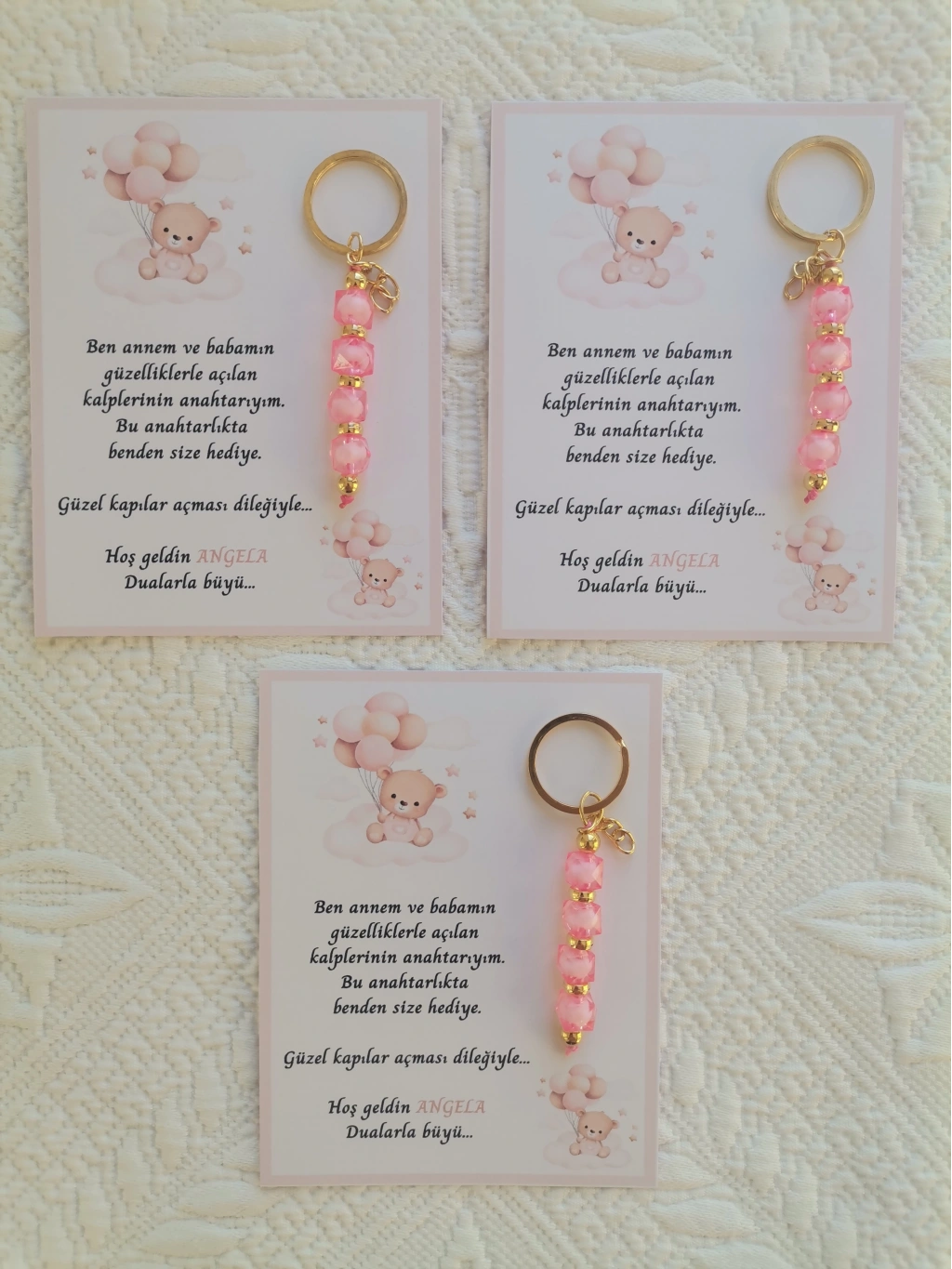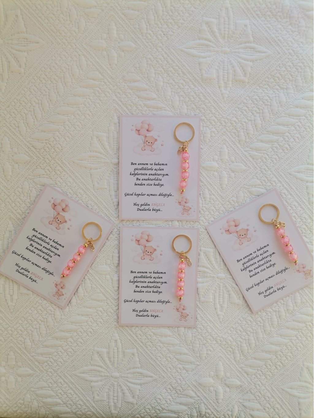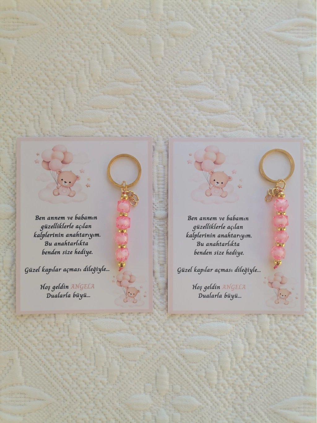 100 adet PEMBE anahtarlık, dualarla büyülü mesajlarla süslenmiş, hastane ve yeni doğan bebeklerinize özel olarak tasarlanmıştır.
