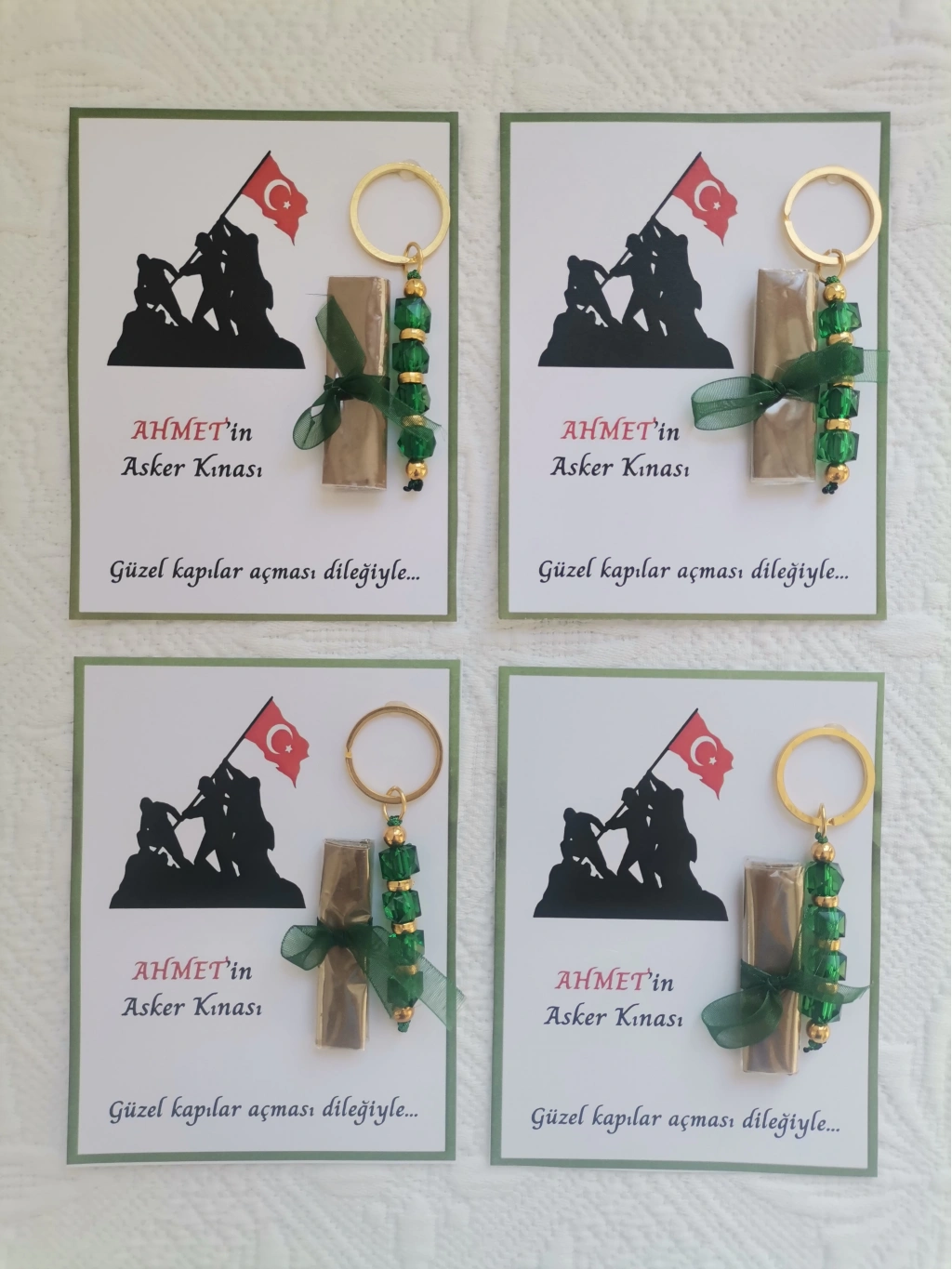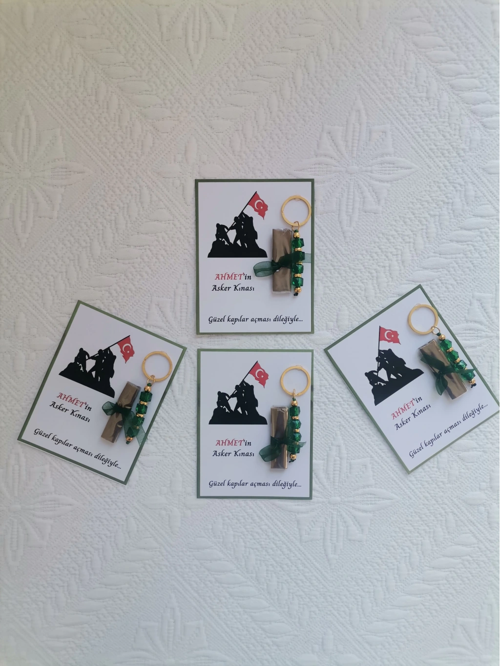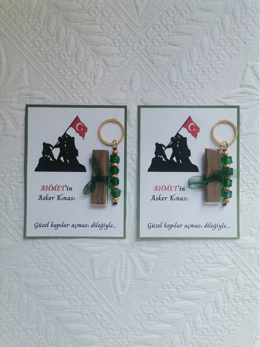 - Kişiye özel olarak hazırlanan bu anahtarlıklar, asker kına hatırası olarak dağıtılabilir ve özel gününüzde sevdiklerinize unutulmaz bir hediye sunar. -