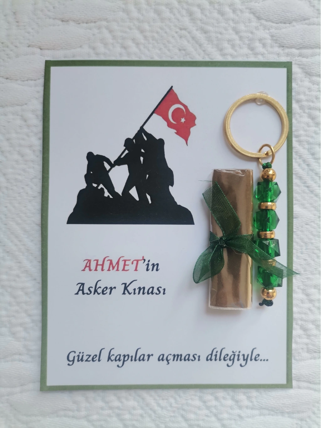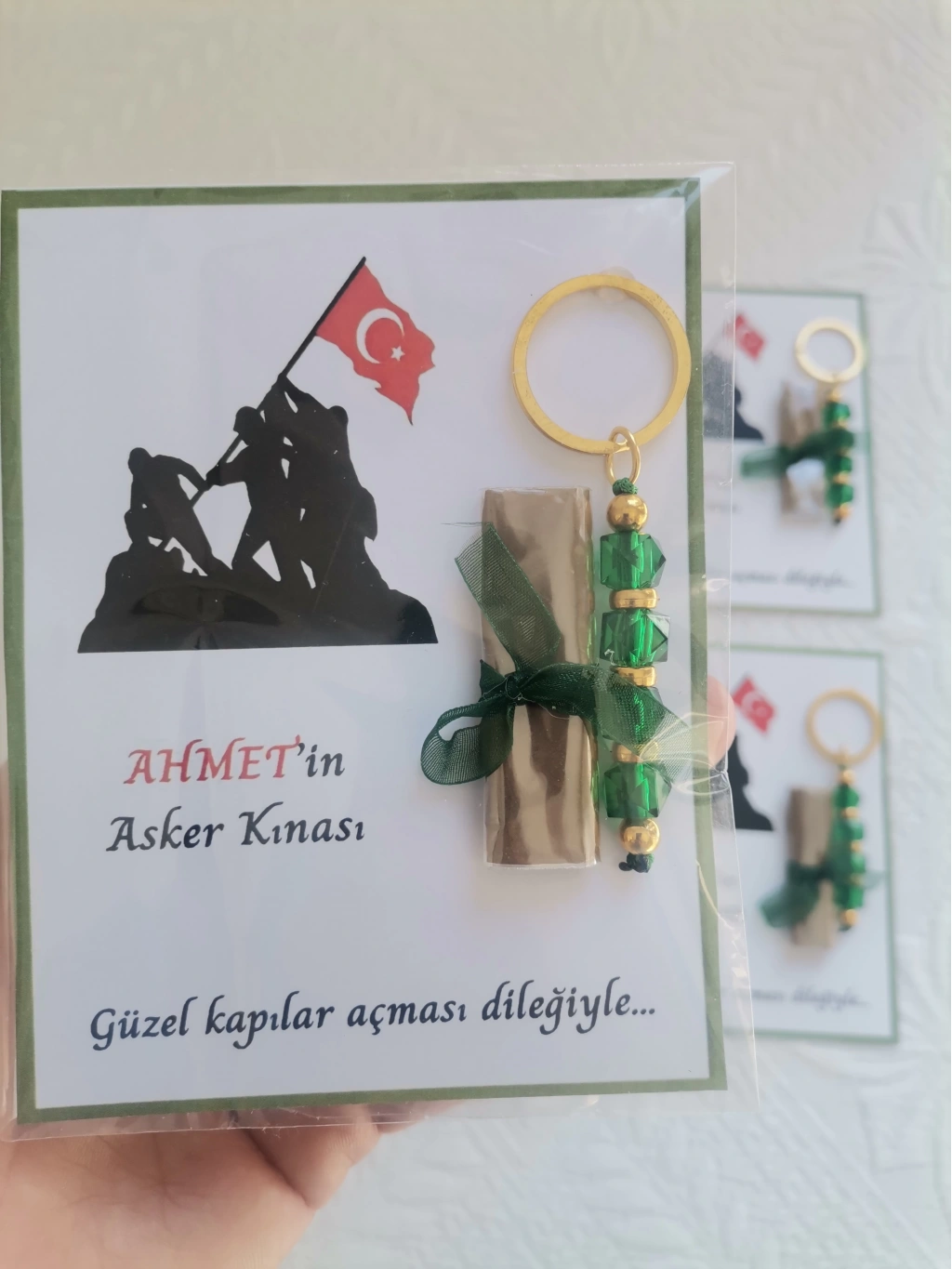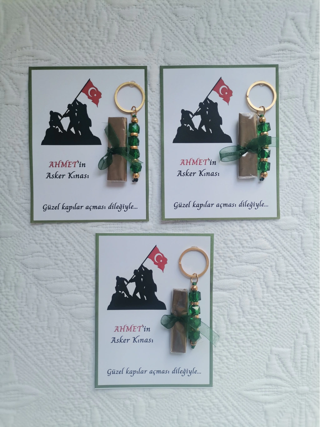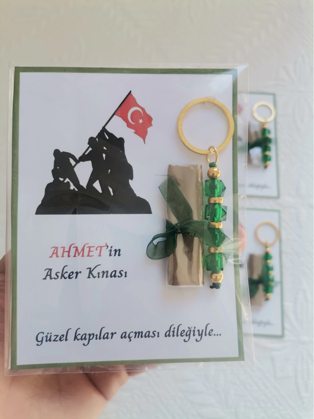 - Kişiye özel olarak hazırlanan bu anahtarlıklar, asker kına hatırası olarak dağıtılabilir ve özel gününüzde sevdiklerinize unutulmaz bir hediye sunar. -