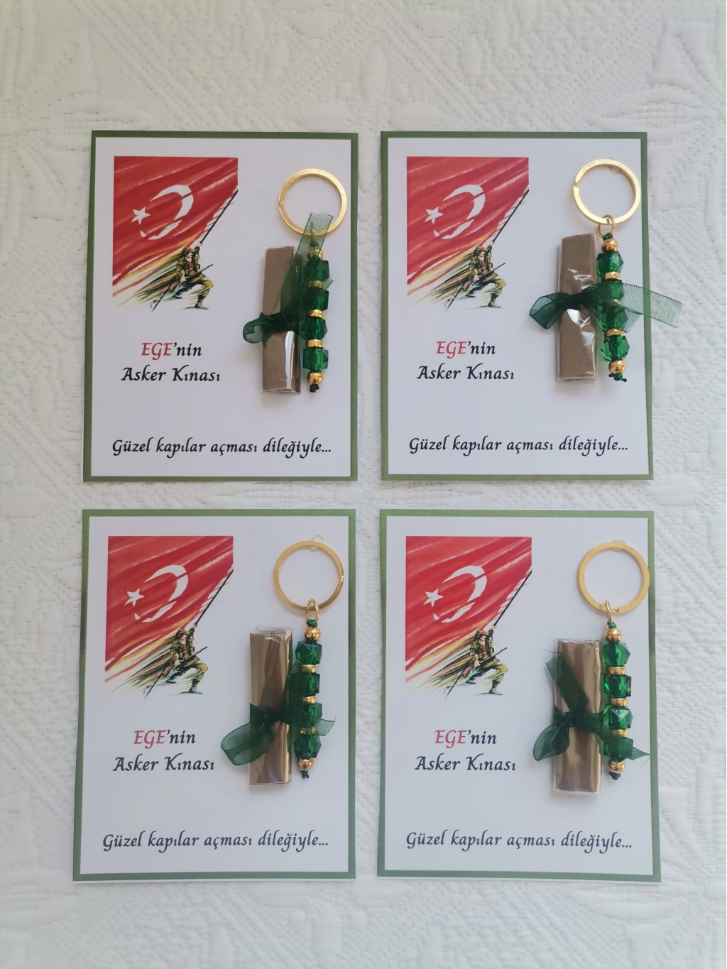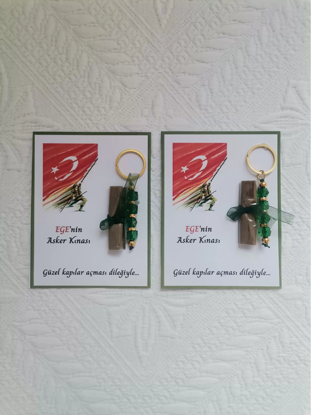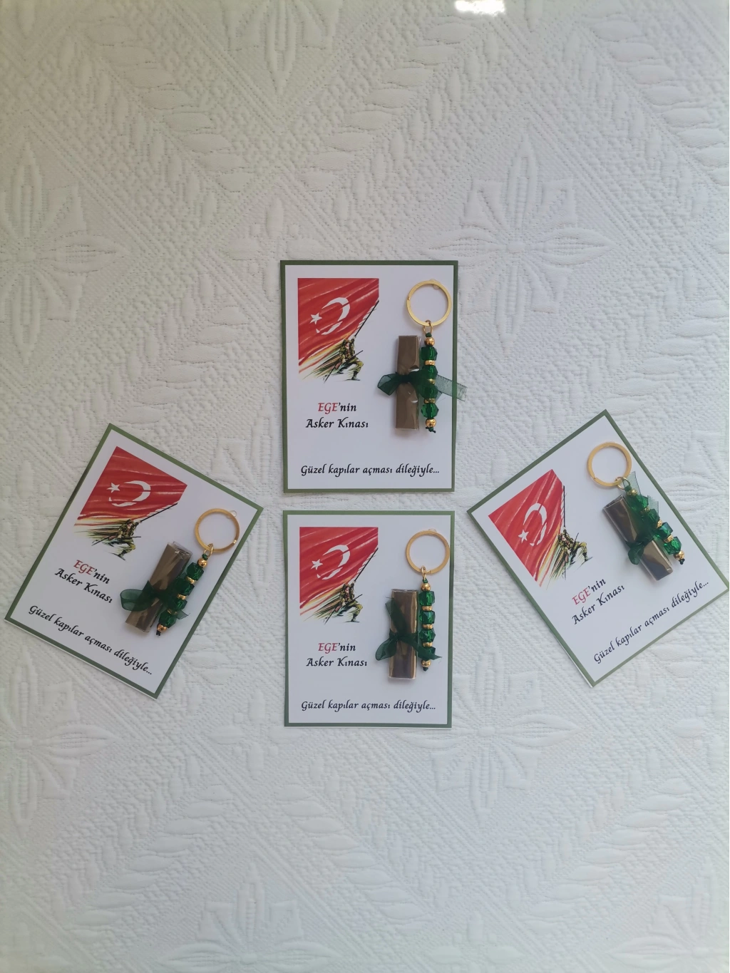 - Kişiye özel olarak hazırlanan bu anahtarlıklar, asker kına hatırası olarak dağıtılabilir ve özel gününüzde sevdiklerinize unutulmaz bir hediye sunar. -