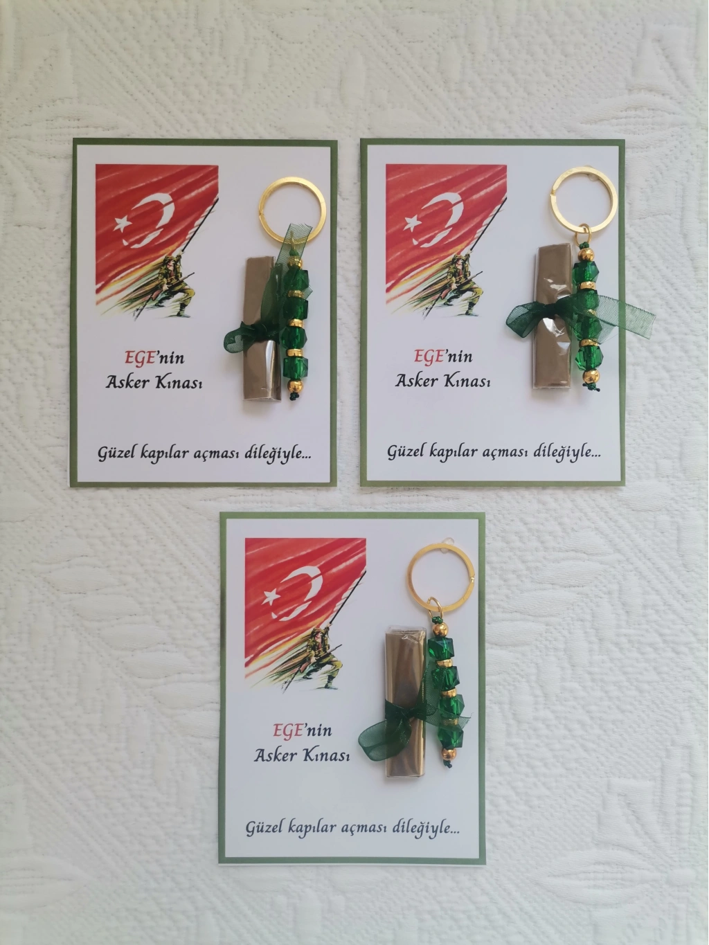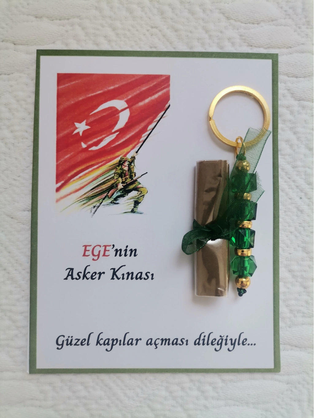 100 Adet Kişiye Özel Asker Kına Hatırası Dağıtmalık Hediyelik Yeşil Anahtarlık ve Paketlenmiş Kına