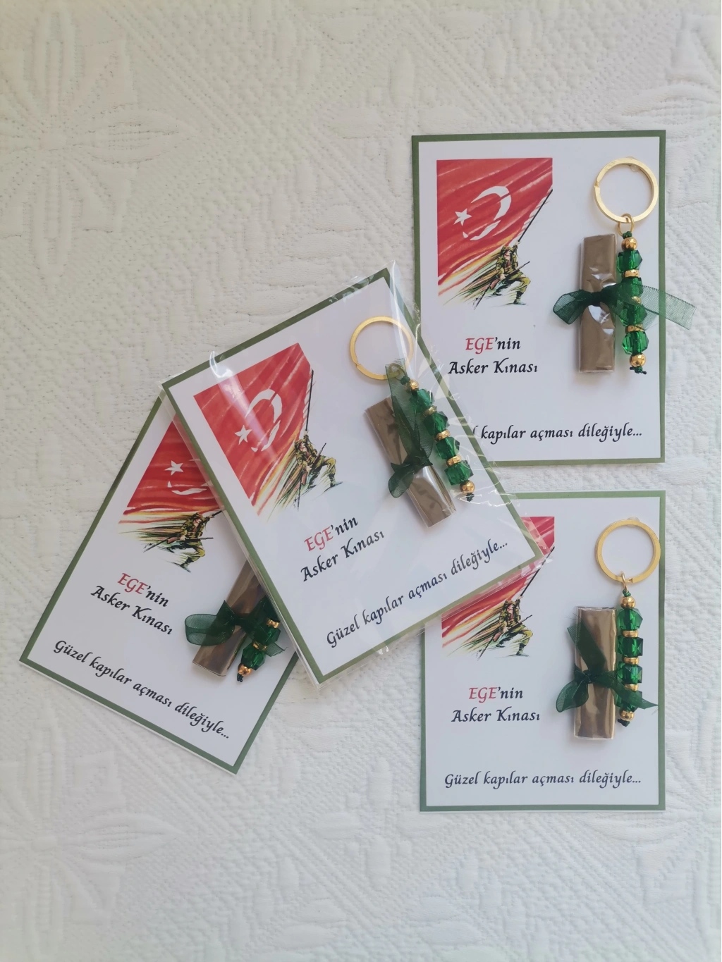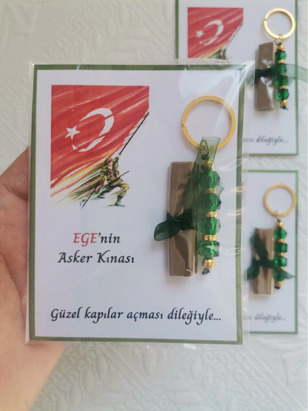 • 100 Adet Kişiye Özel Asker Kına Hatırası Dağıtmalık Hediyelik Yeşil Anahtarlık ve Paketlenmiş Kına