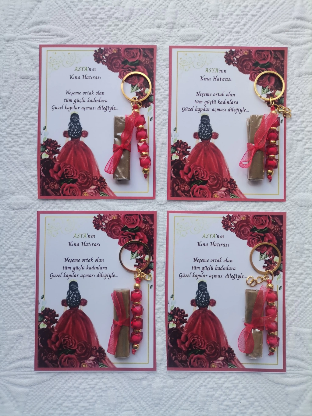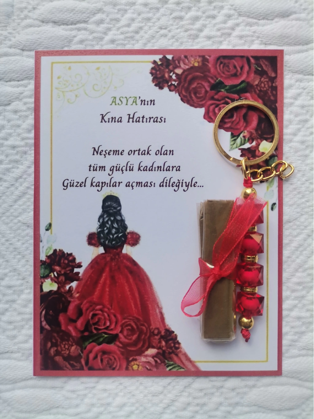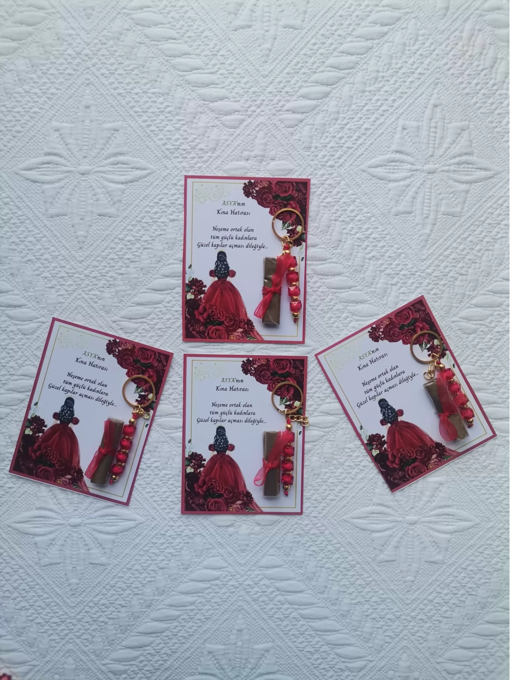 • 100 Adet Kişiye Özel Kına Hatırası Dağıtmalık Hediyelik Kırmızı Anahtarlık ve Paketlenmiş Kına