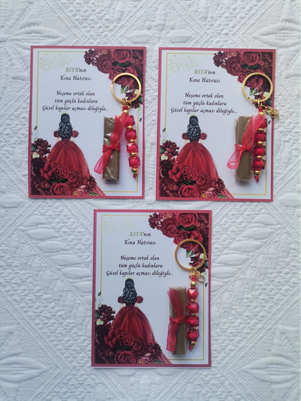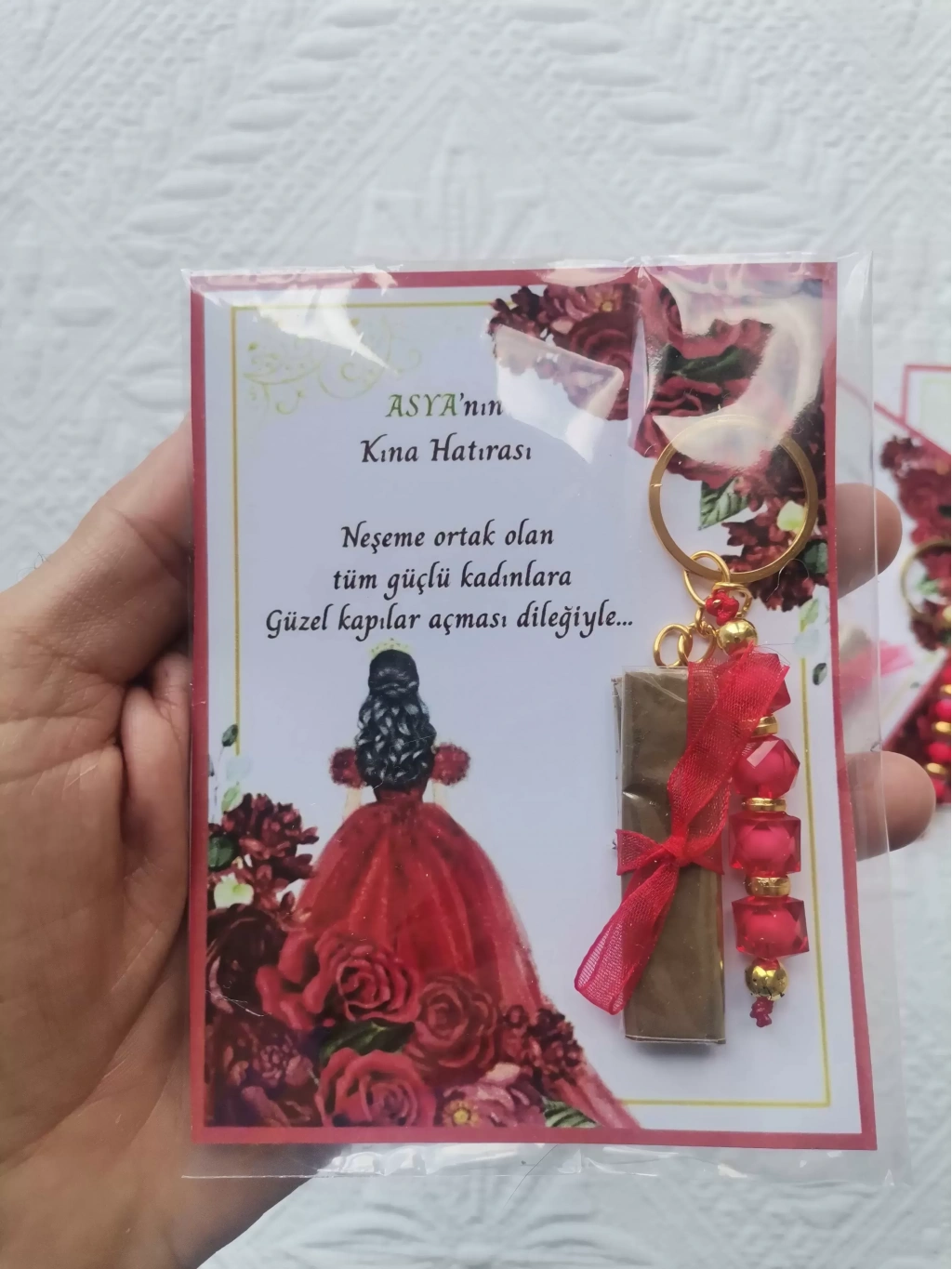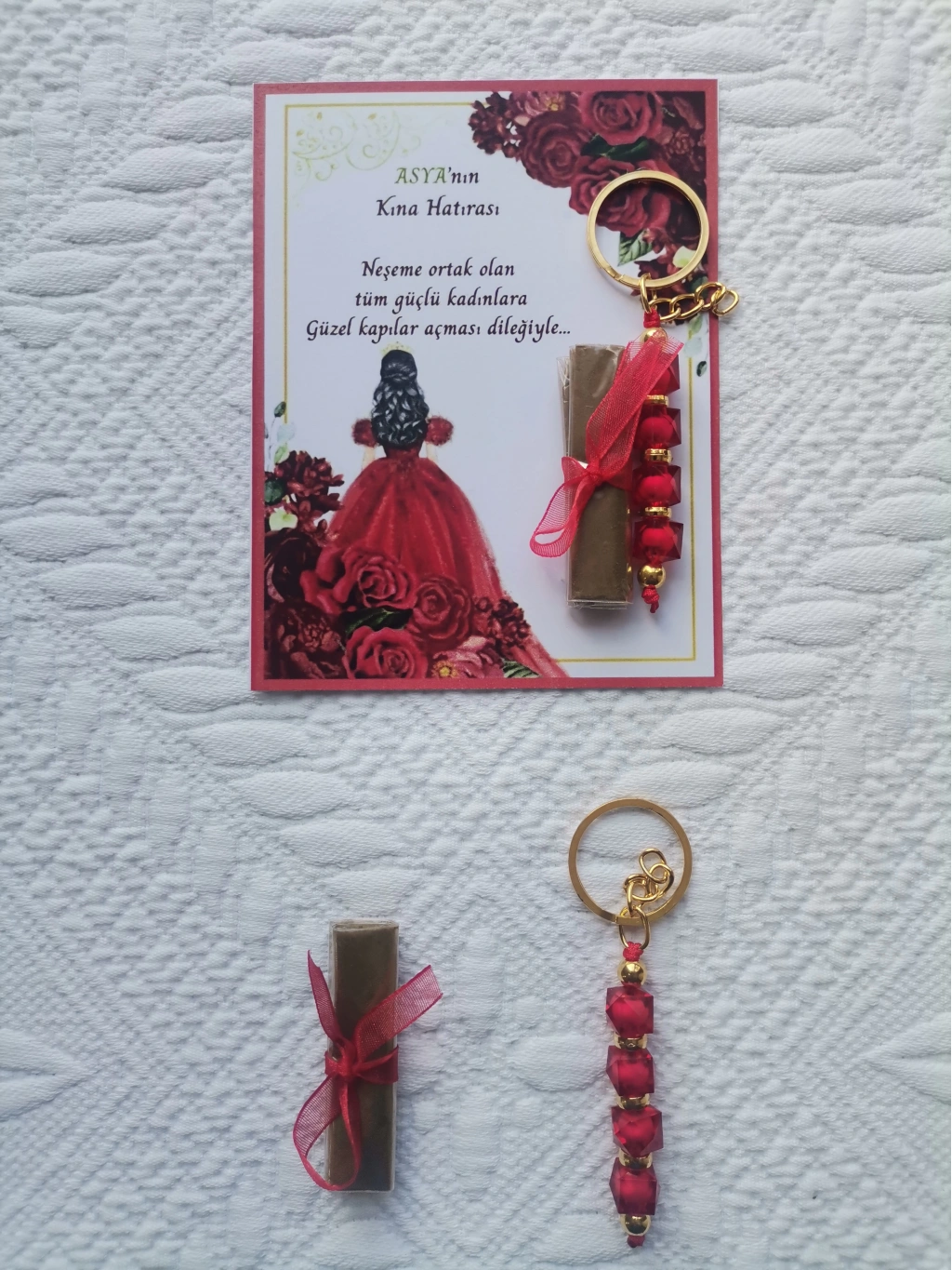 • 100 Adet Kişiye Özel Kına Hatırası Dağıtmalık Hediyelik Kırmızı Anahtarlık ve Paketlenmiş Kına
