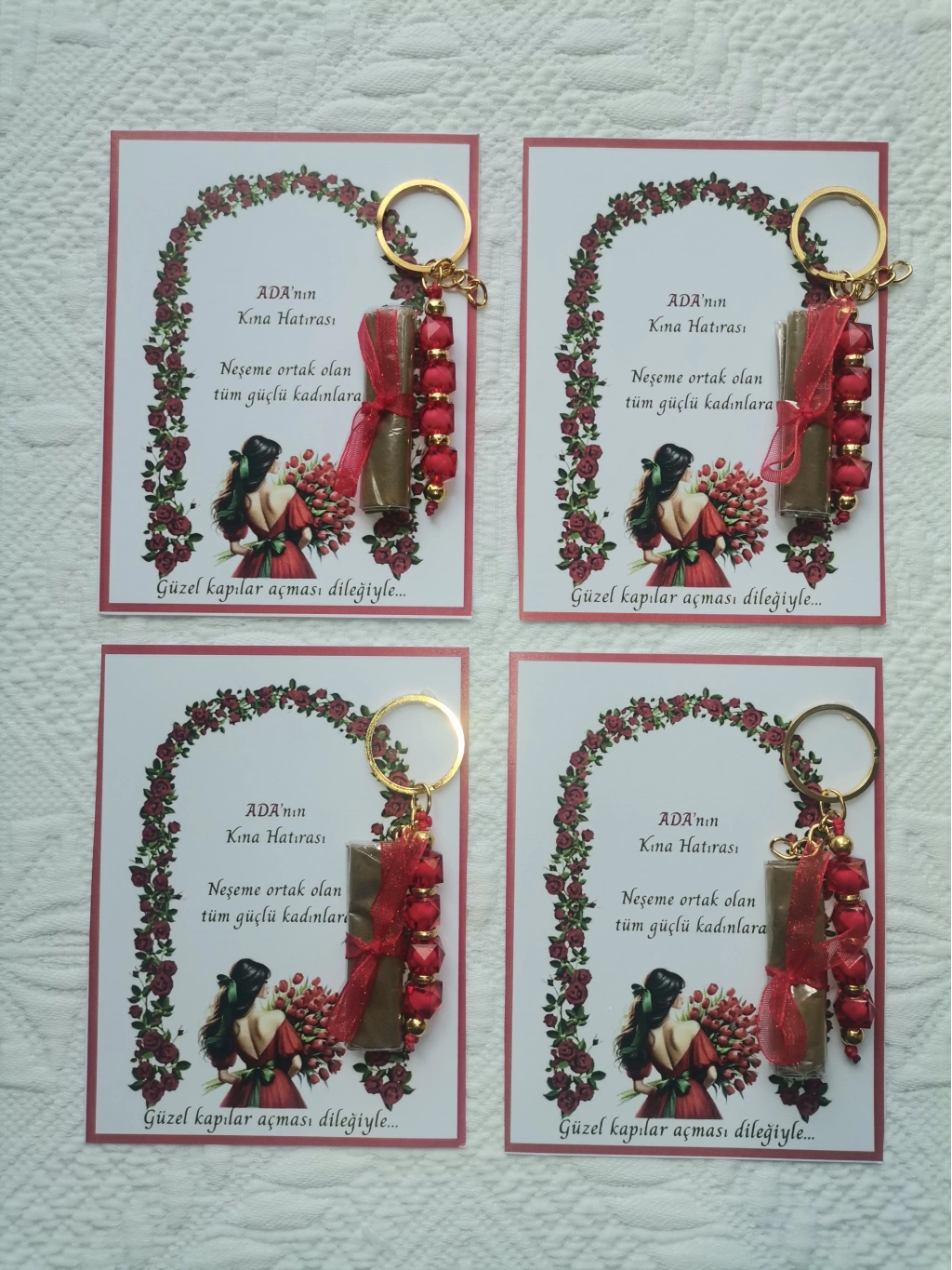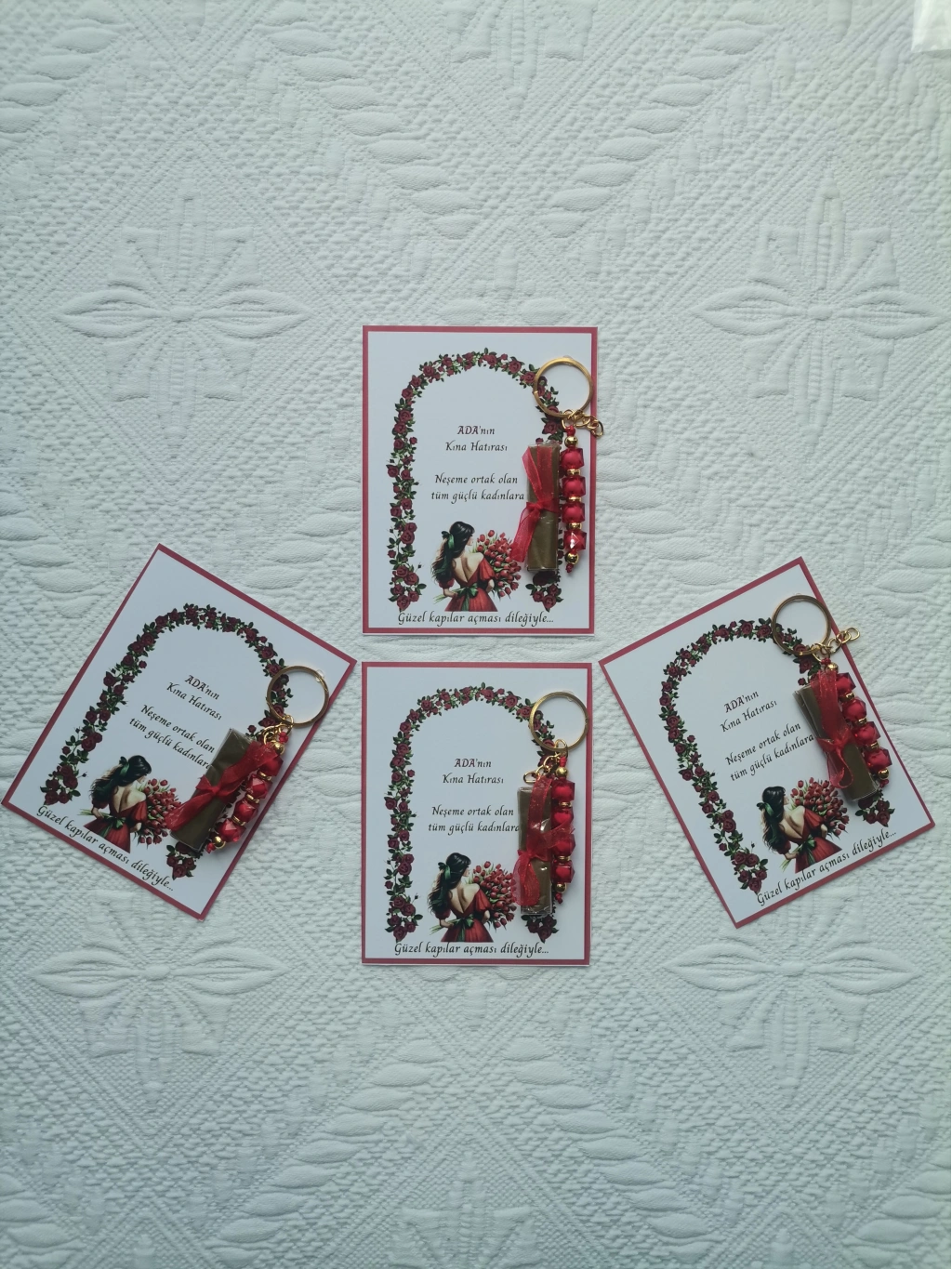 Kırmızı anahtarlıklar, kına gecenizin renk temasına uygun olarak tasarlanmıştır ve uzun süreli kullanım için dayanıklıdır. -