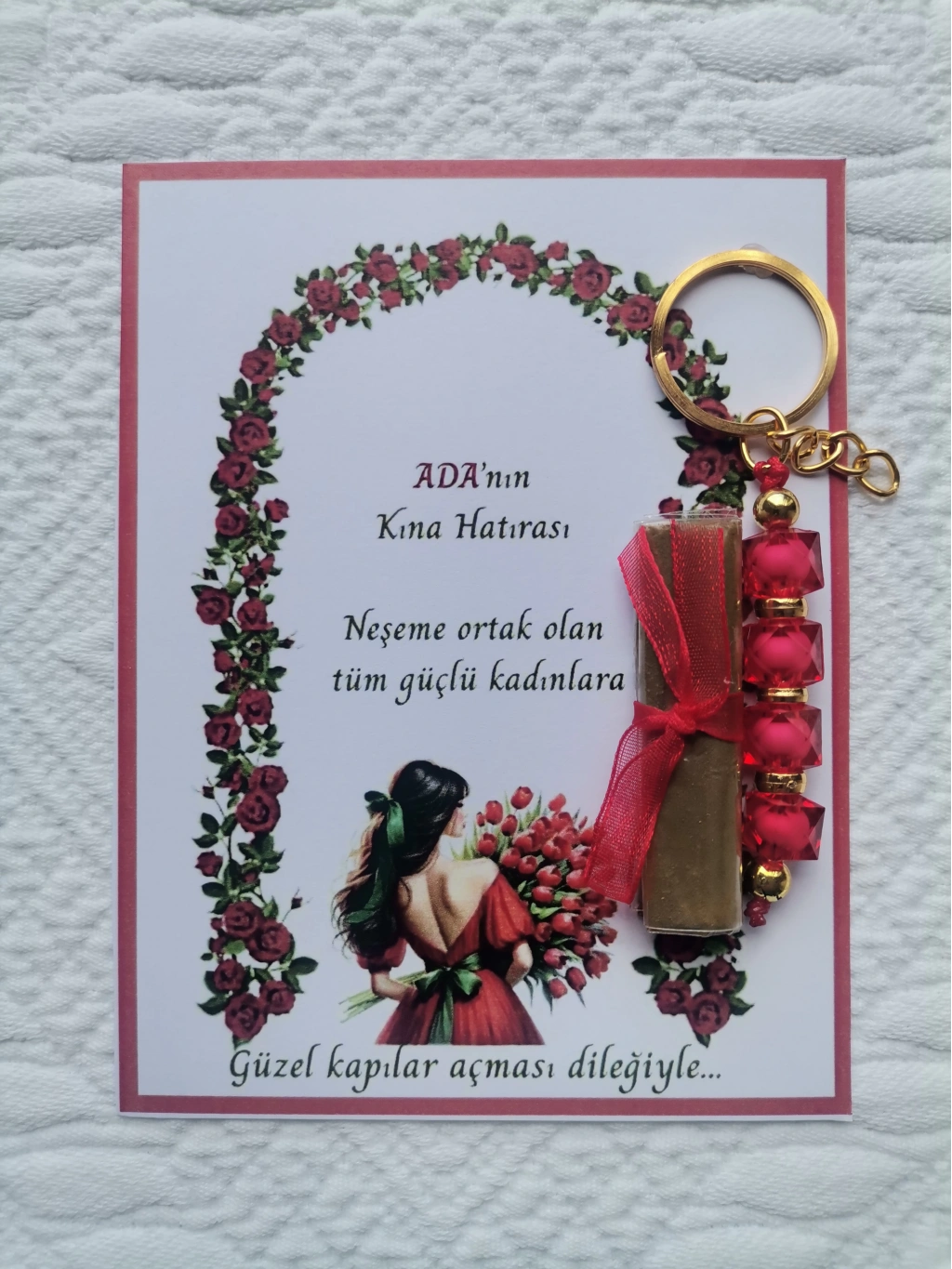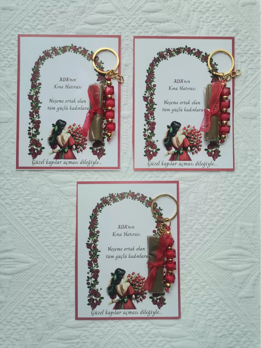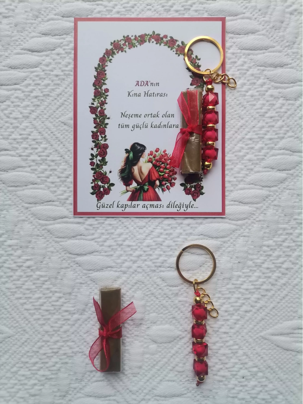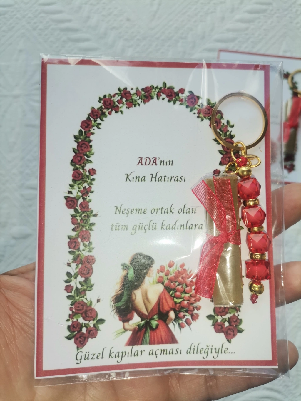 • 100 Adet Kişiye Özel Kına Hatırası Dağıtmalık Hediyelik Kırmızı Anahtarlık ve Paketlenmiş Kına