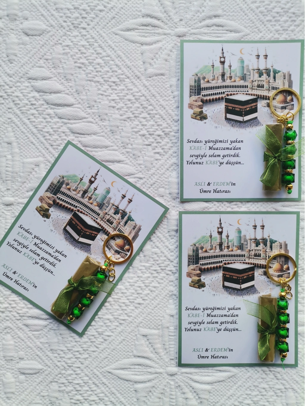 Hac, Umre, Mevlid ve Kına gibi anlamlı günlerde dağıtmalık olarak hazırlanan bu kişiye özel tasarım anahtarlıklar, hem şık görünümü hem de özel baskı imkânı sayesinde kalıcı bir hatıra sunar.