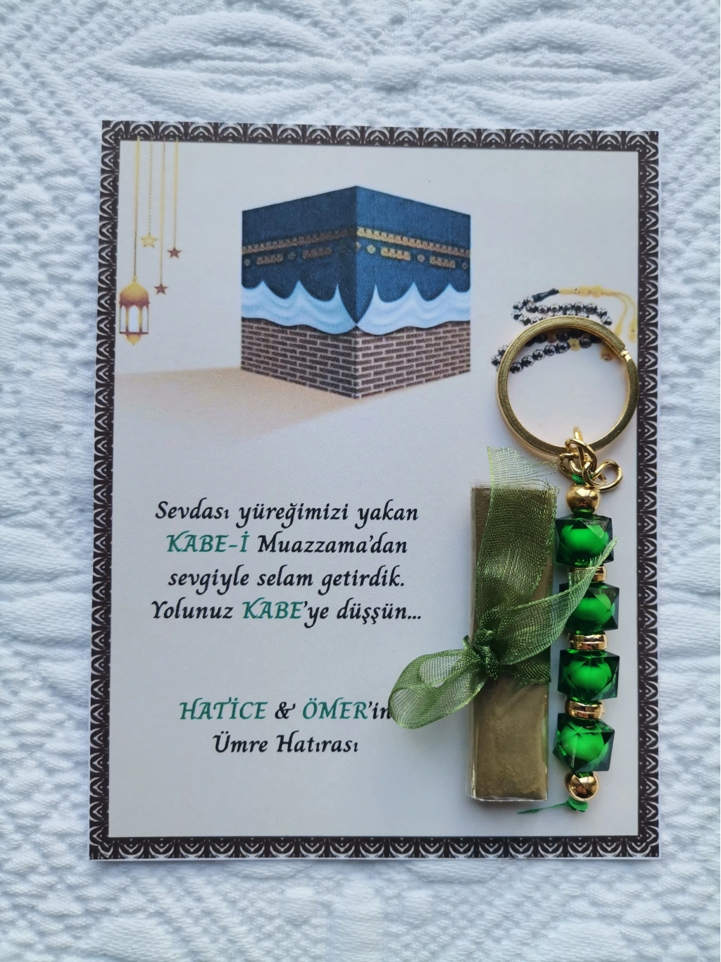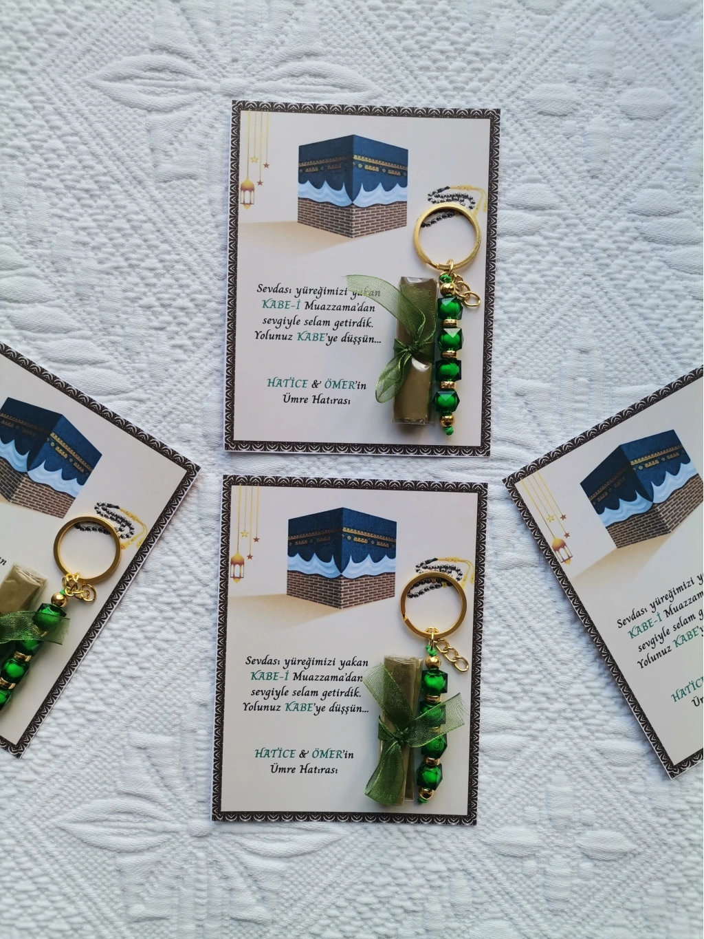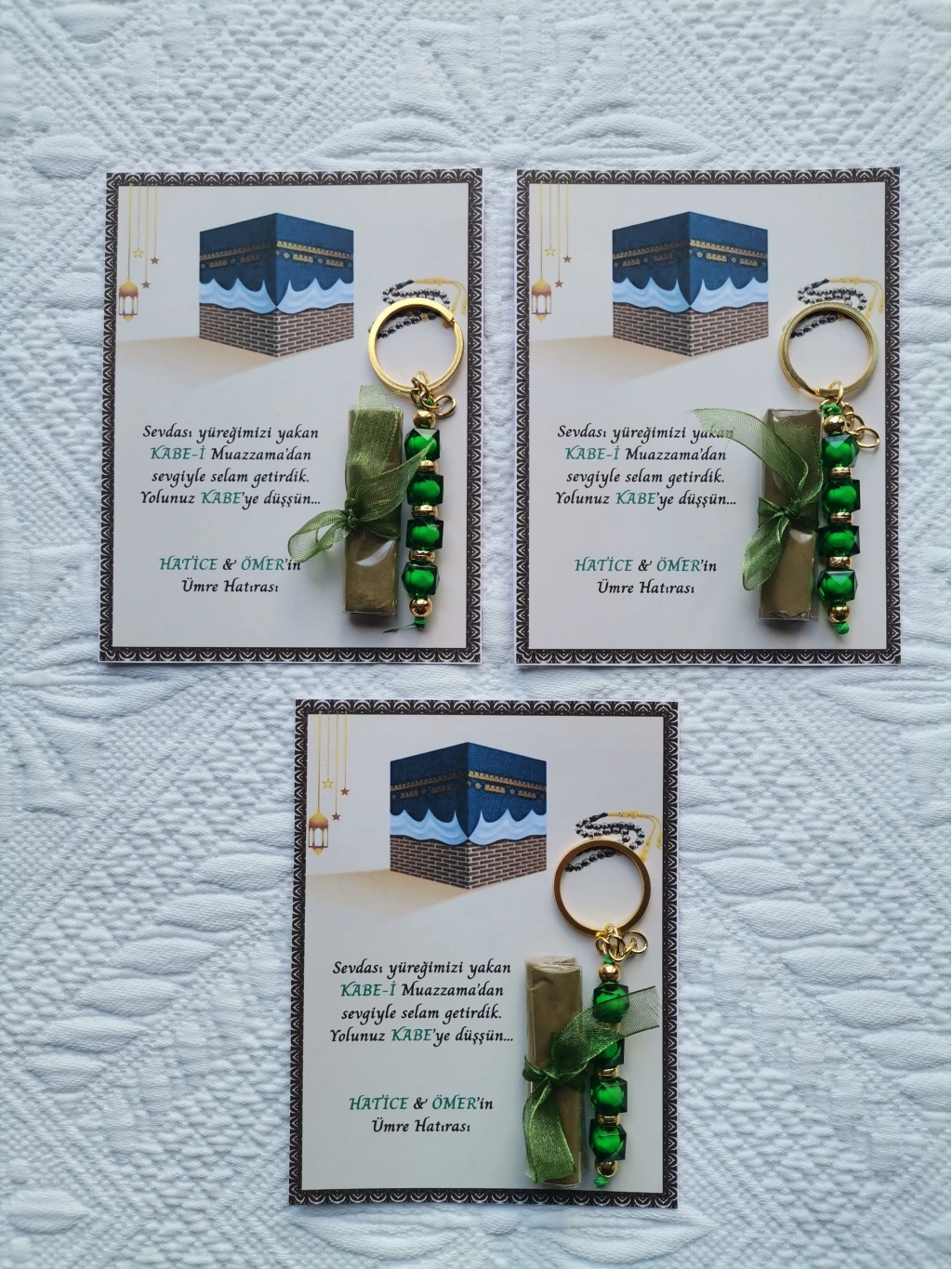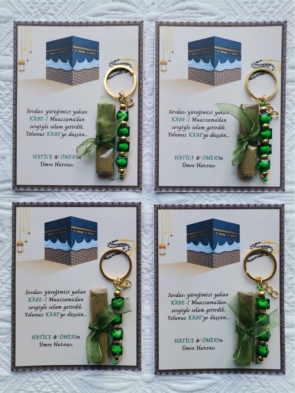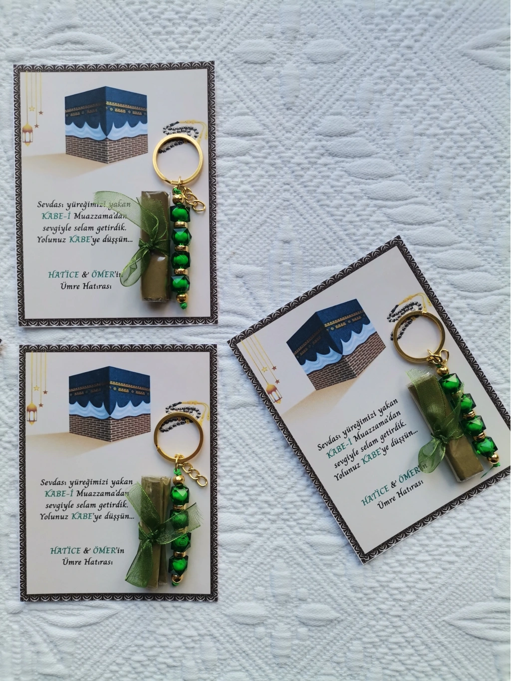• 100 Adet Kişiye Özel Tasarım Hac Umre Mevlid Hatırası Dağıtmalık Hediyelik Yeşil Anahtarlık ve Kına