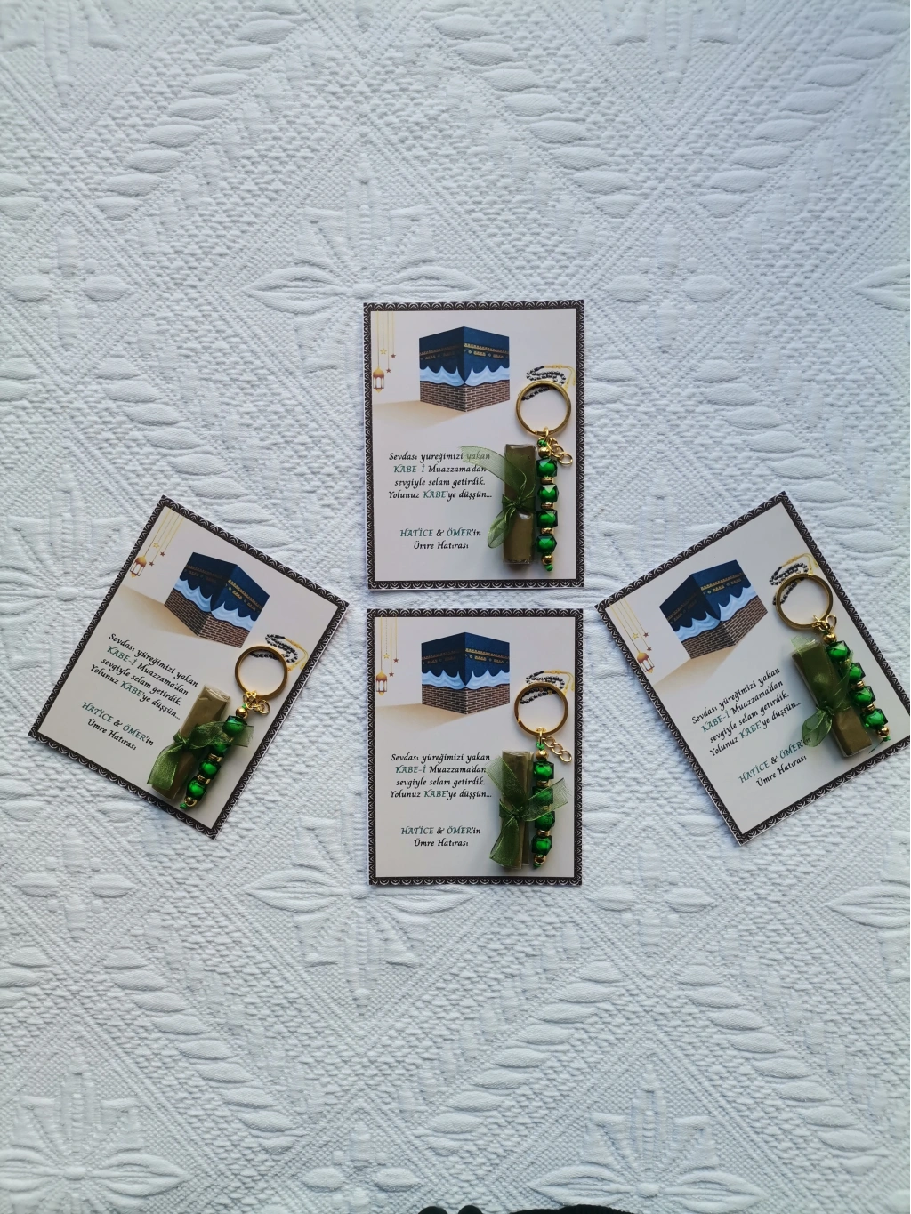 Hac, Umre, Mevlid ve Kına gibi anlamlı günlerde dağıtmalık olarak hazırlanan bu kişiye özel tasarım anahtarlıklar, hem şık görünümü hem de özel baskı imkânı sayesinde kalıcı bir hatıra sunar.
