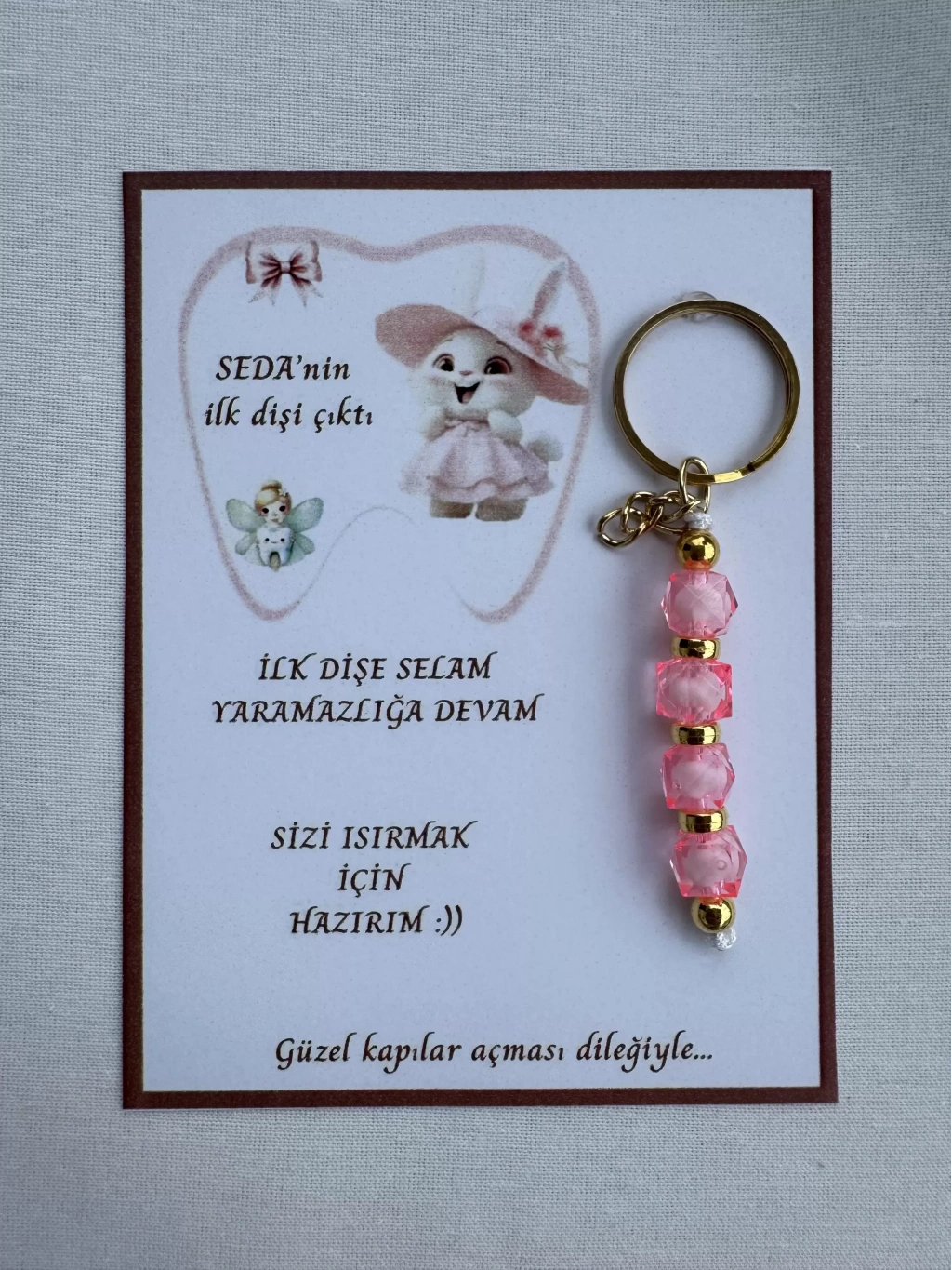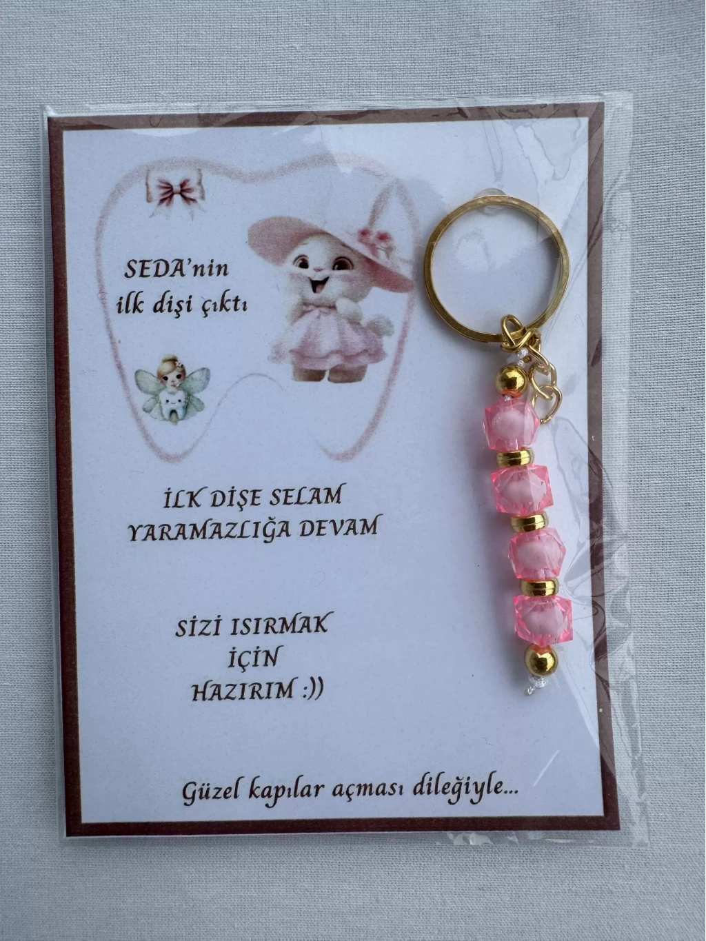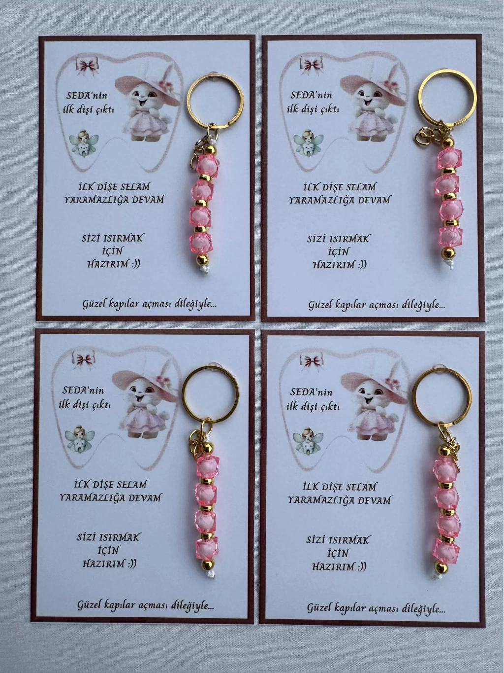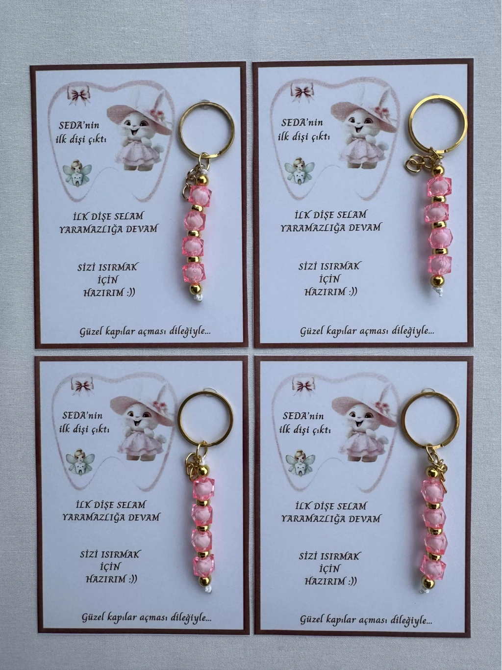 • 100 Adet Pembe Renk İsme Özel İlk Dişim Çıktı Diş Partisi Diş Buğdayı Hatırası Hediyelik Anahtarlık