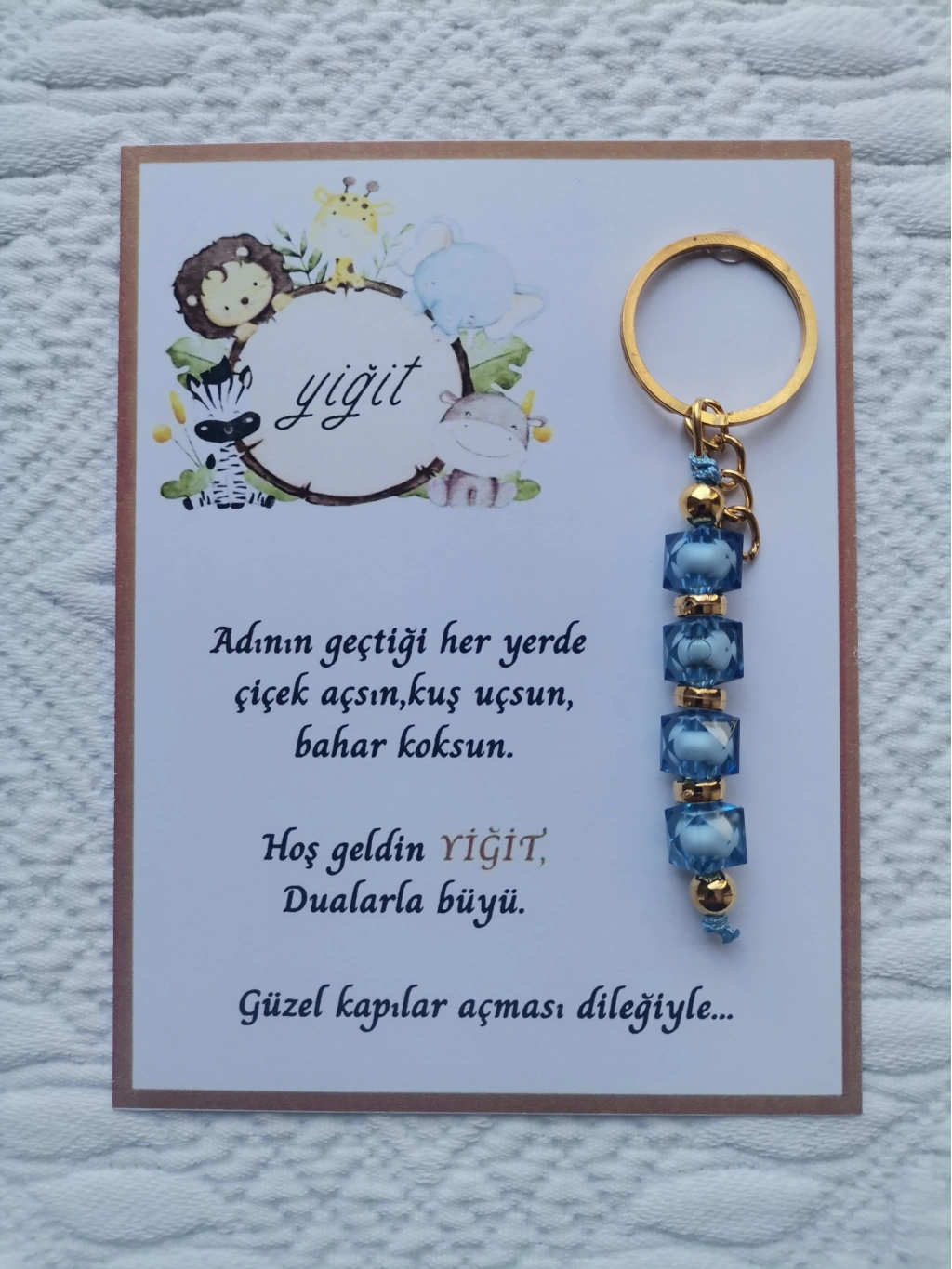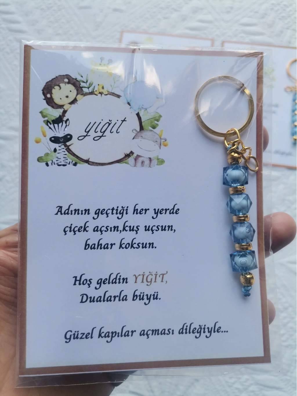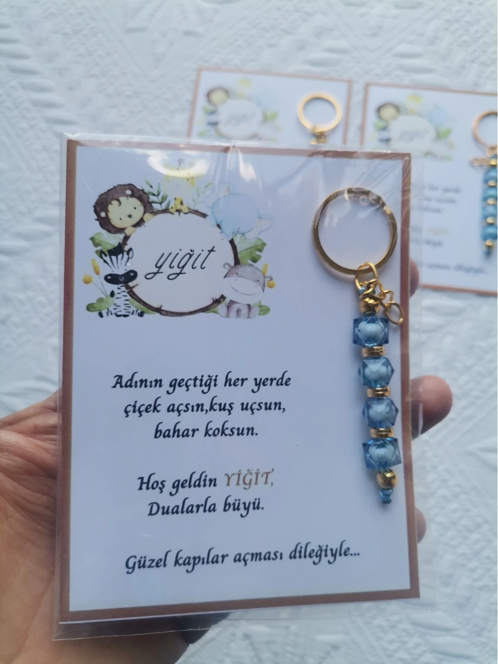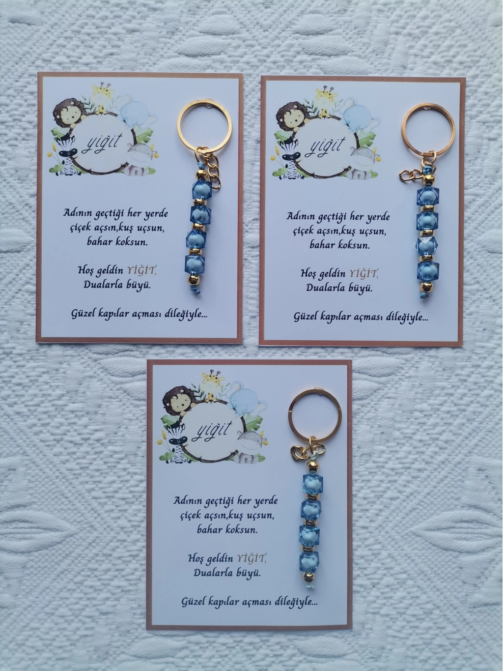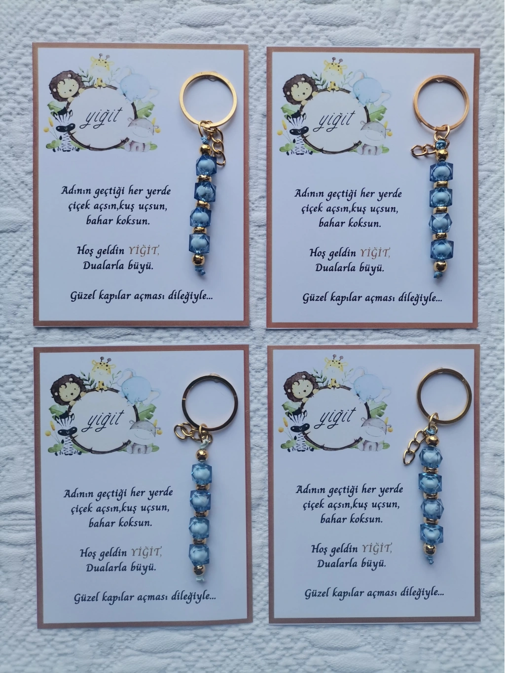 32 adet MAVİ anahtarlık, dualarla büyülü mesajlarla süslenmiş, hastane ve yeni doğan bebeklerinize özel olarak tasarlanmıştır.