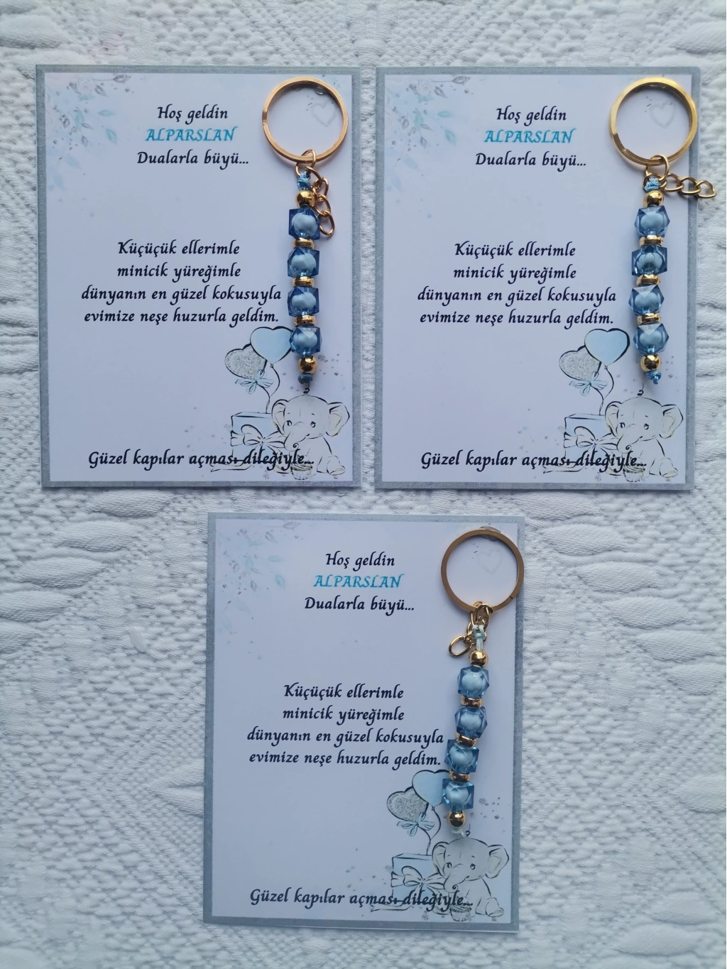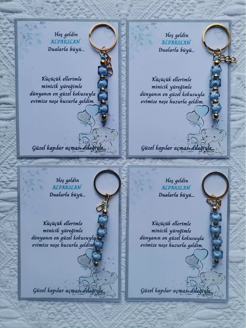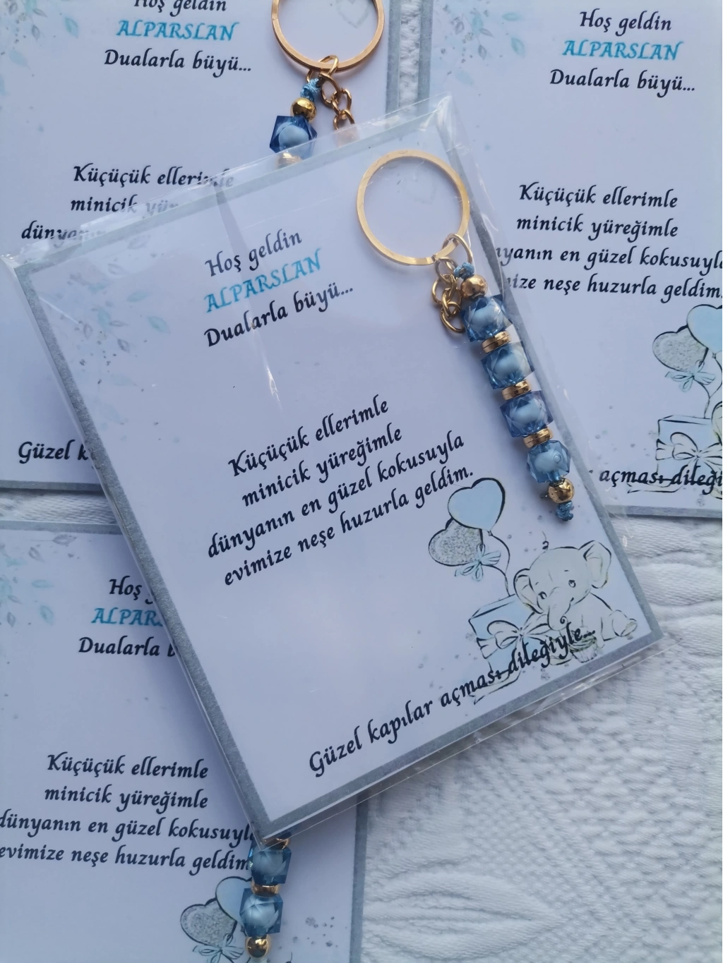 32 adet MAVİ anahtarlık, dualarla büyülü mesajlarla süslenmiş, hastane ve yeni doğan bebeklerinize özel olarak tasarlanmıştır.