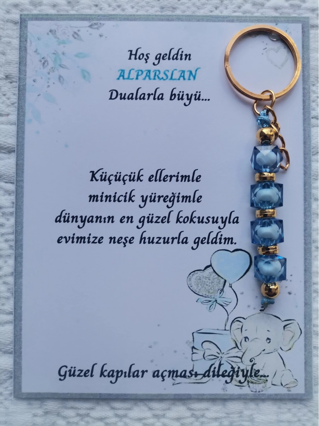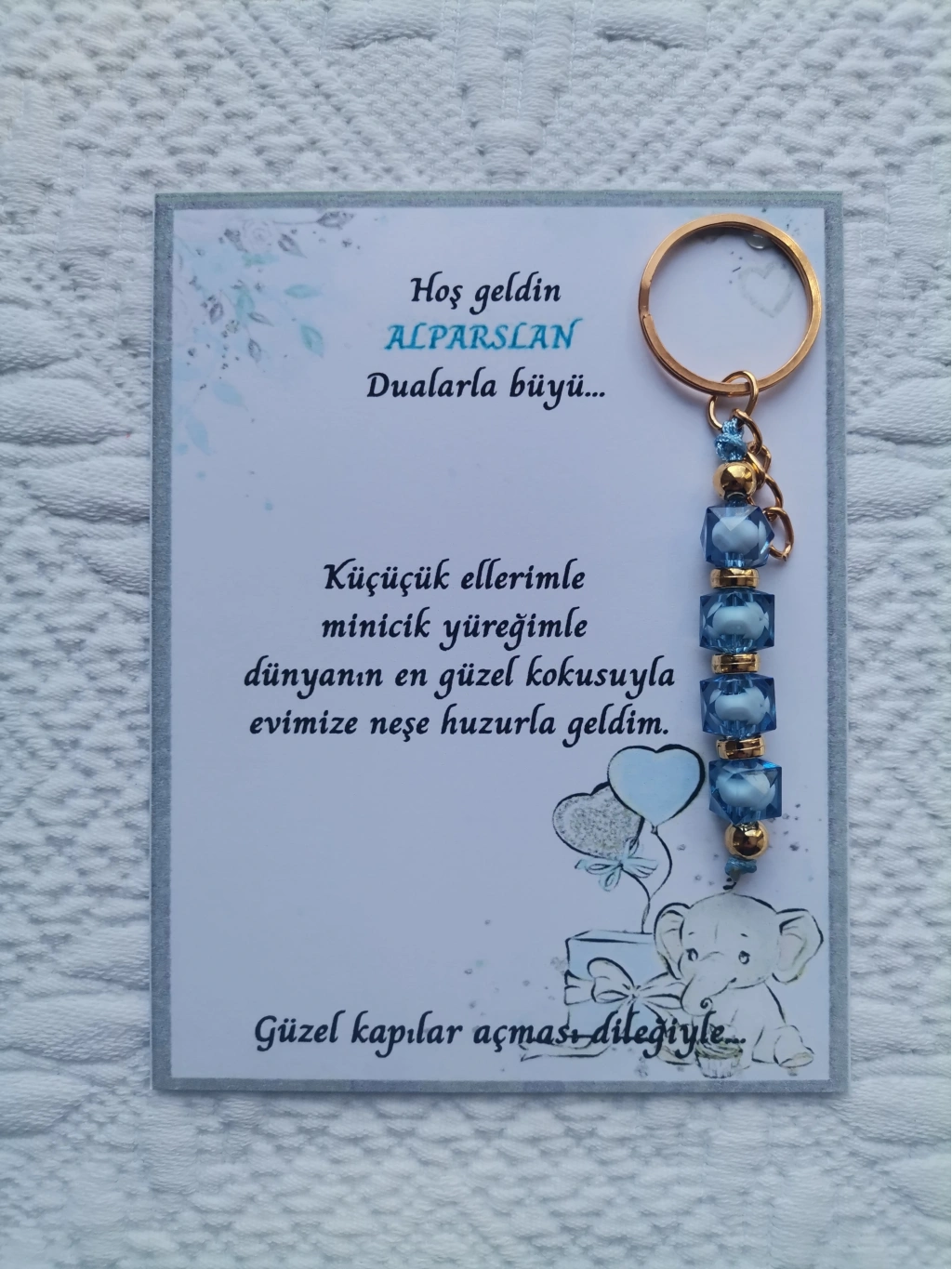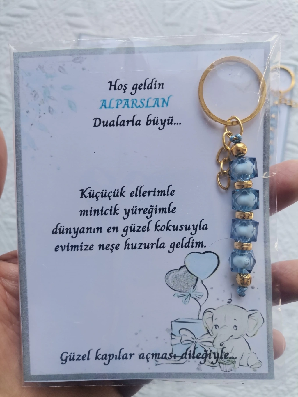 32 adet MAVİ anahtarlık, dualarla büyülü mesajlarla süslenmiş, hastane ve yeni doğan bebeklerinize özel olarak tasarlanmıştır.