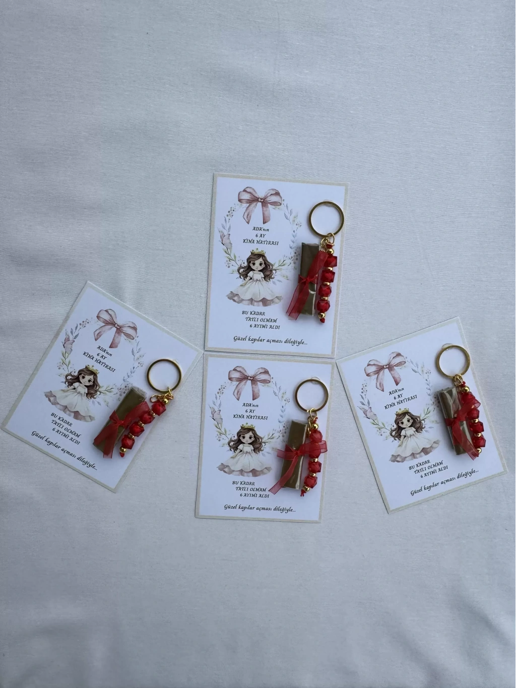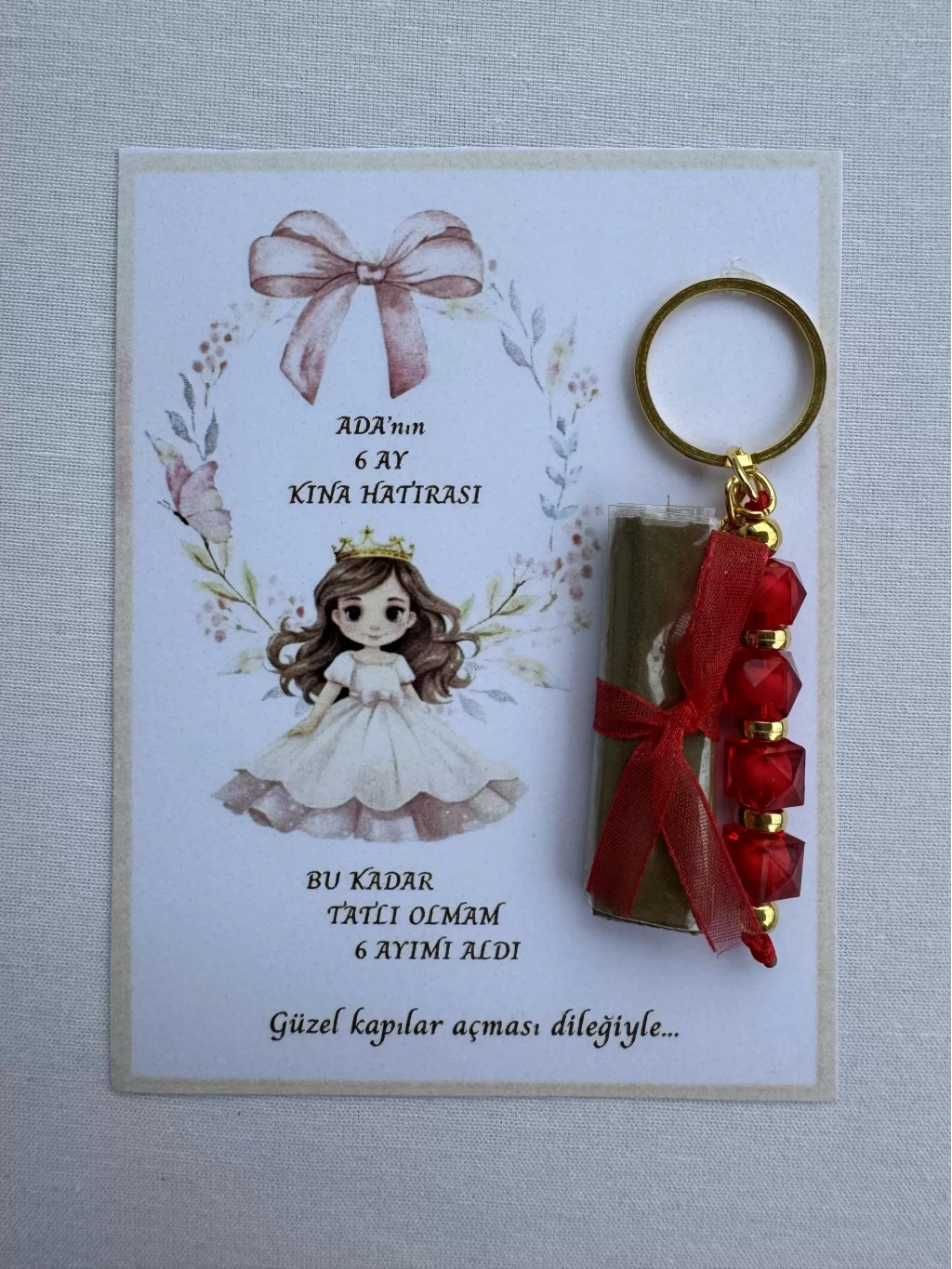 Her bir anahtarlık, kırmızı renkli tasarımıyla dikkat çeker ve 6 ay kınasının şıklığını tamamlar.