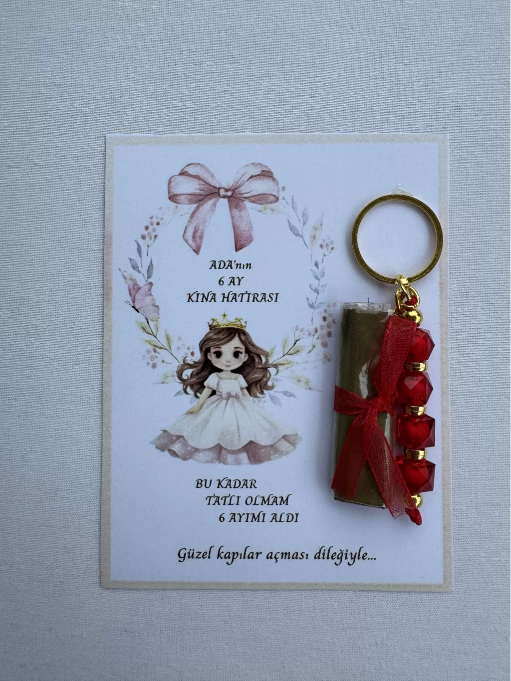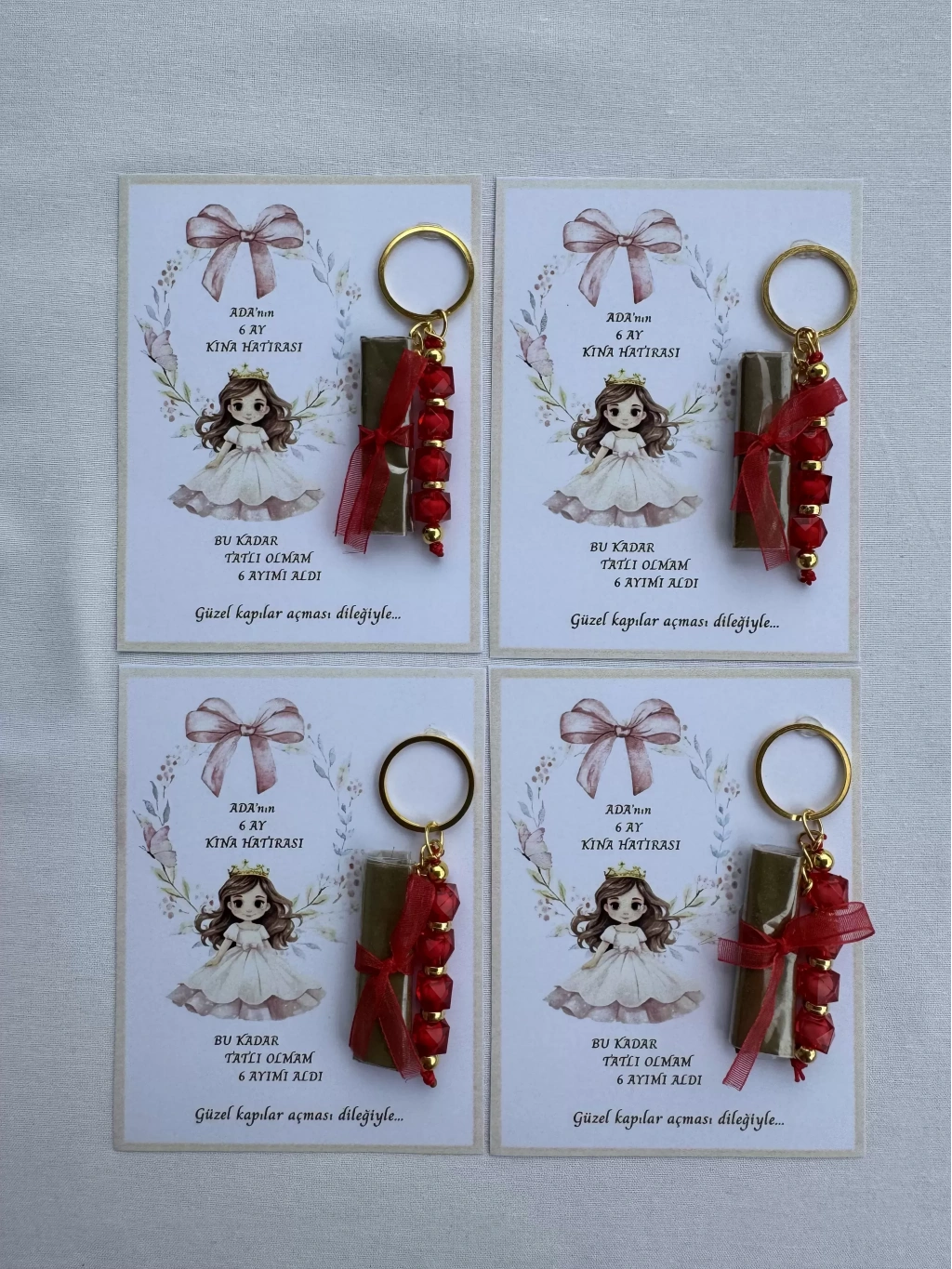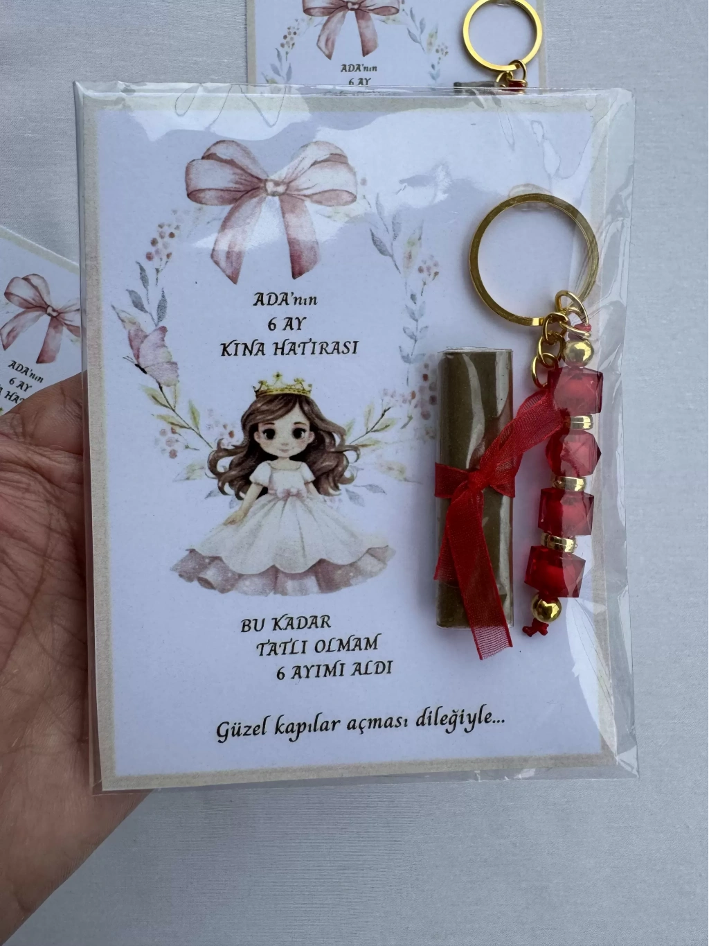 Kişisel dokunuşunuzu yansıtan 32 adet kişiye özel 6 ay kına hatırası anahtarlık, sevdiklerinize unutulmaz anılar bırakmanızı sağlar.