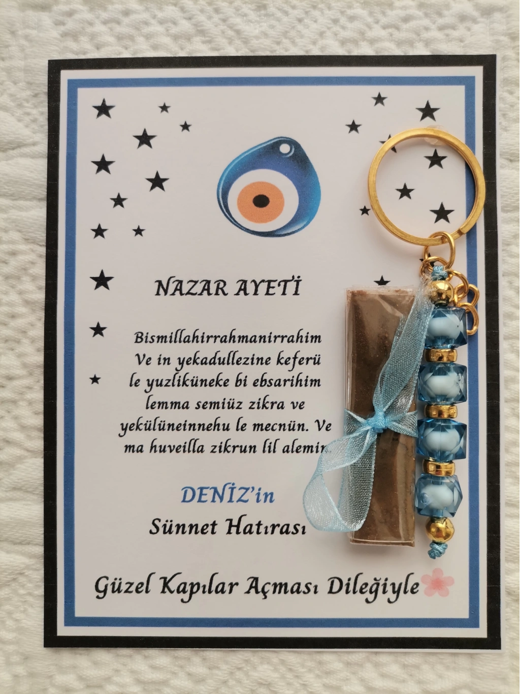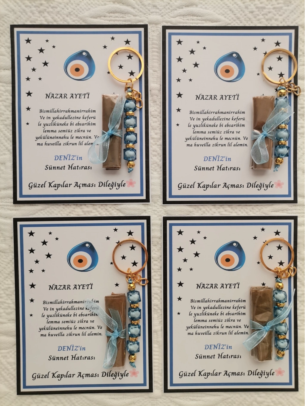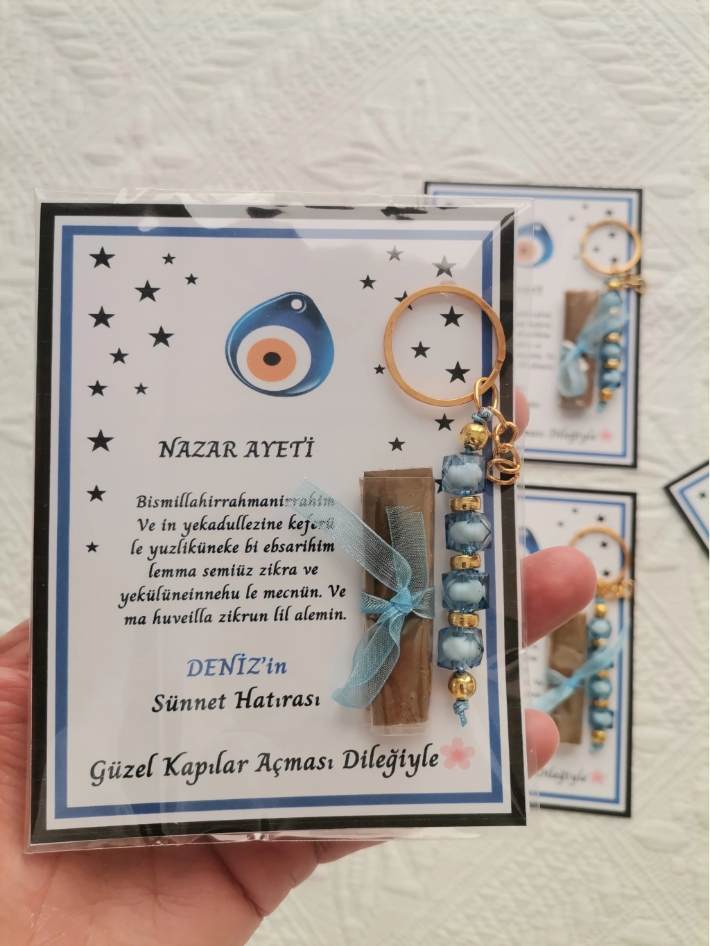 • 32 Adet Kişiye Özel Nazar Ayeti Sünnet Hatırası Dağıtmalık Hediyelik Mavi Anahtarlık ve Kına