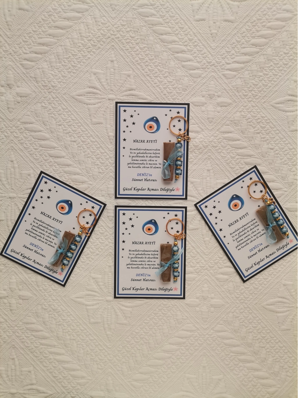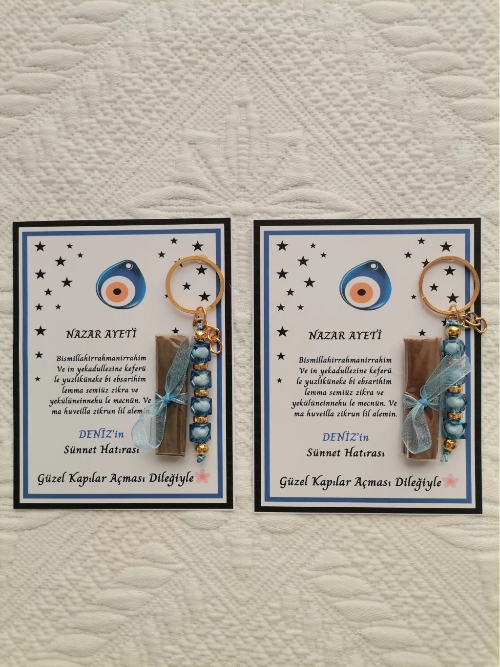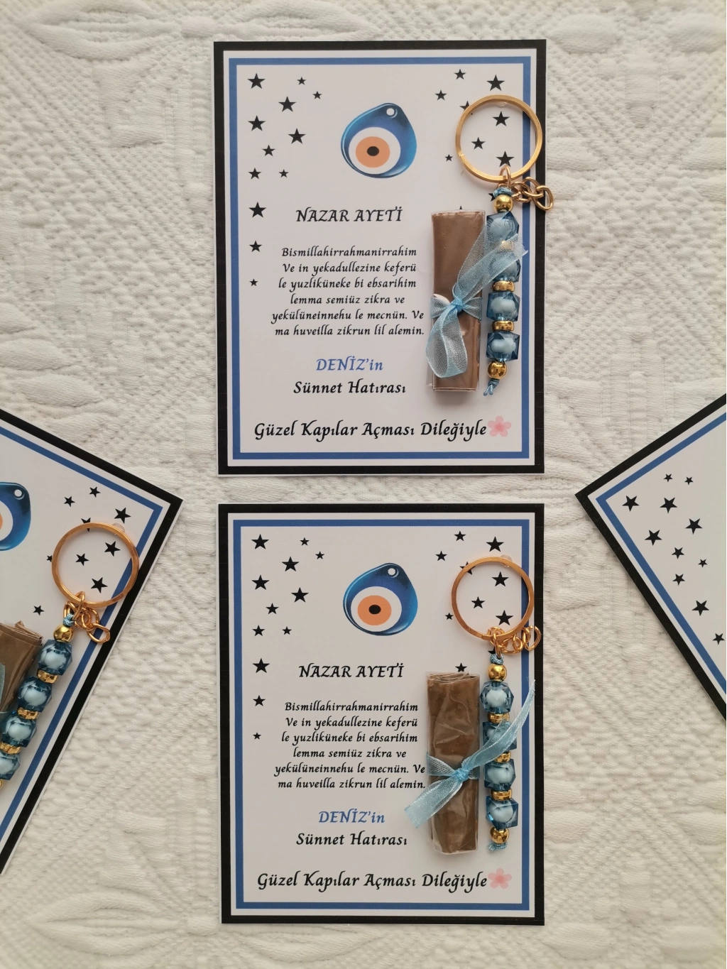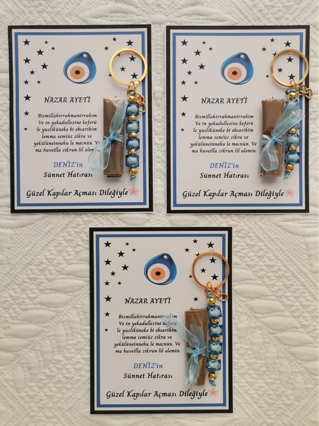 • 32 Adet Kişiye Özel Nazar Ayeti Sünnet Hatırası Dağıtmalık Hediyelik Mavi Anahtarlık ve Kına