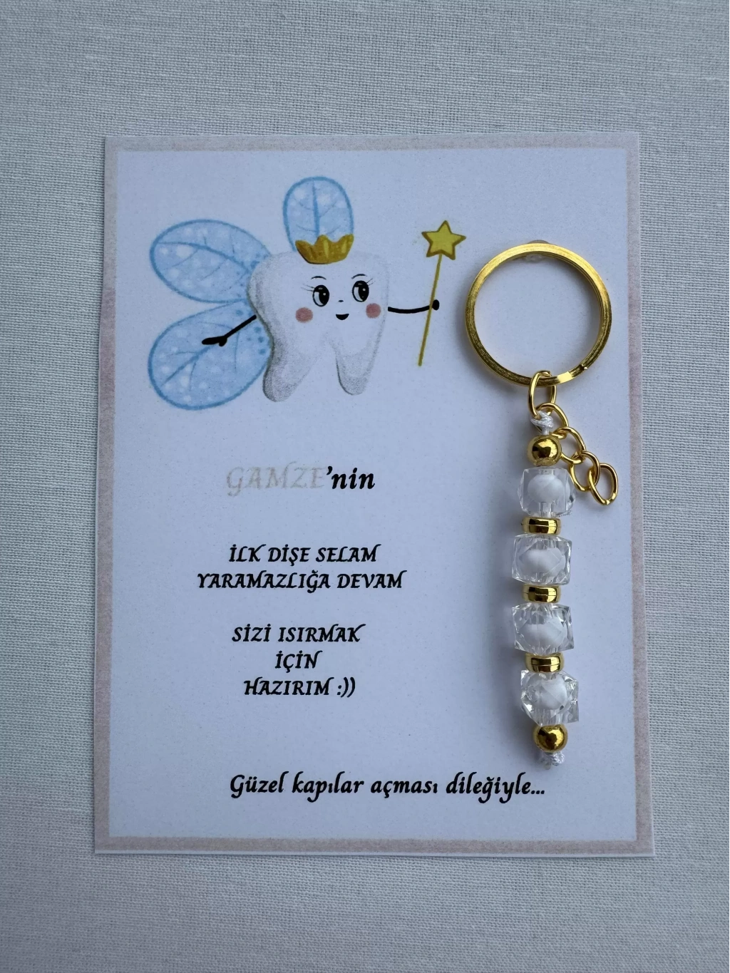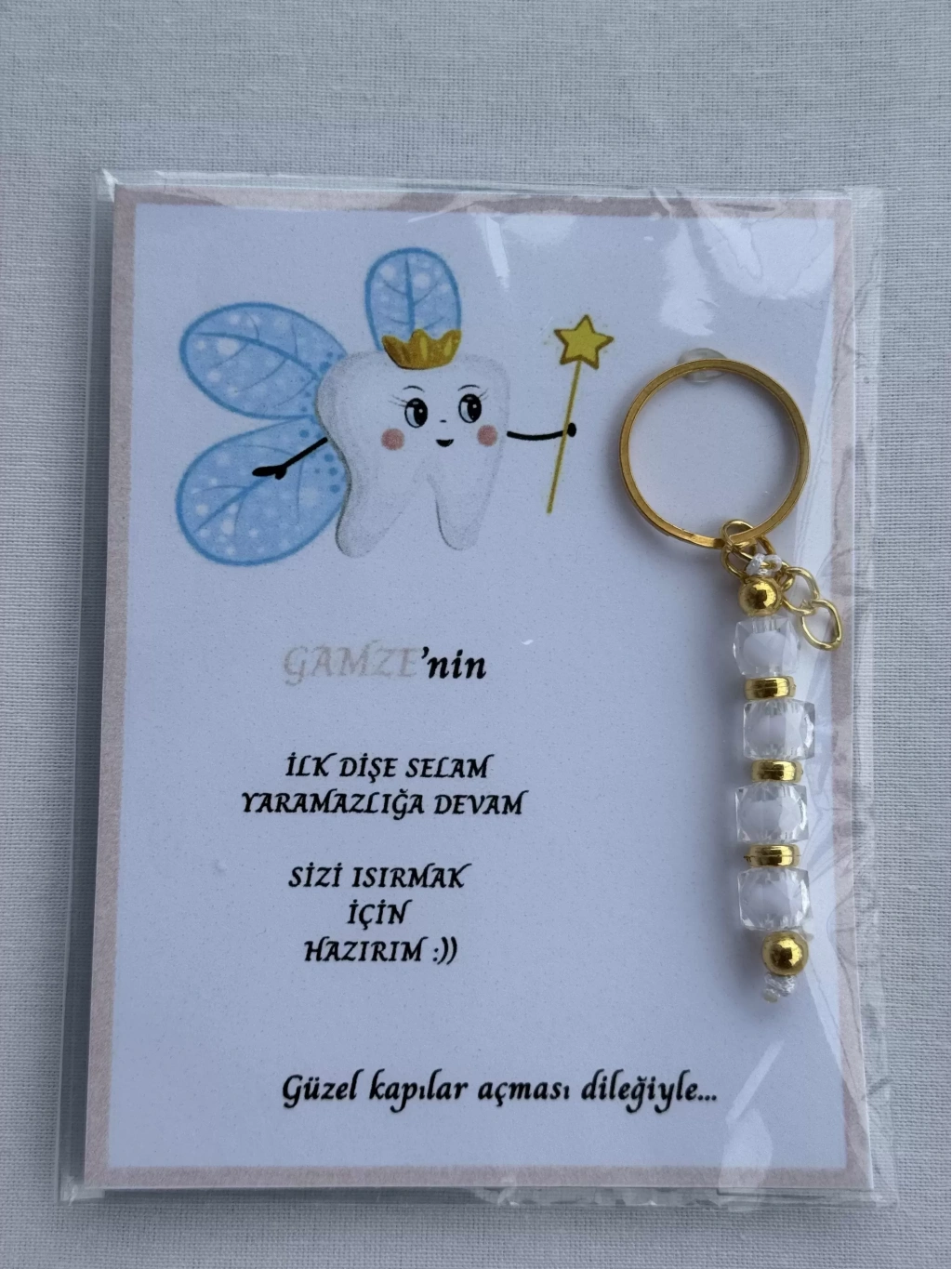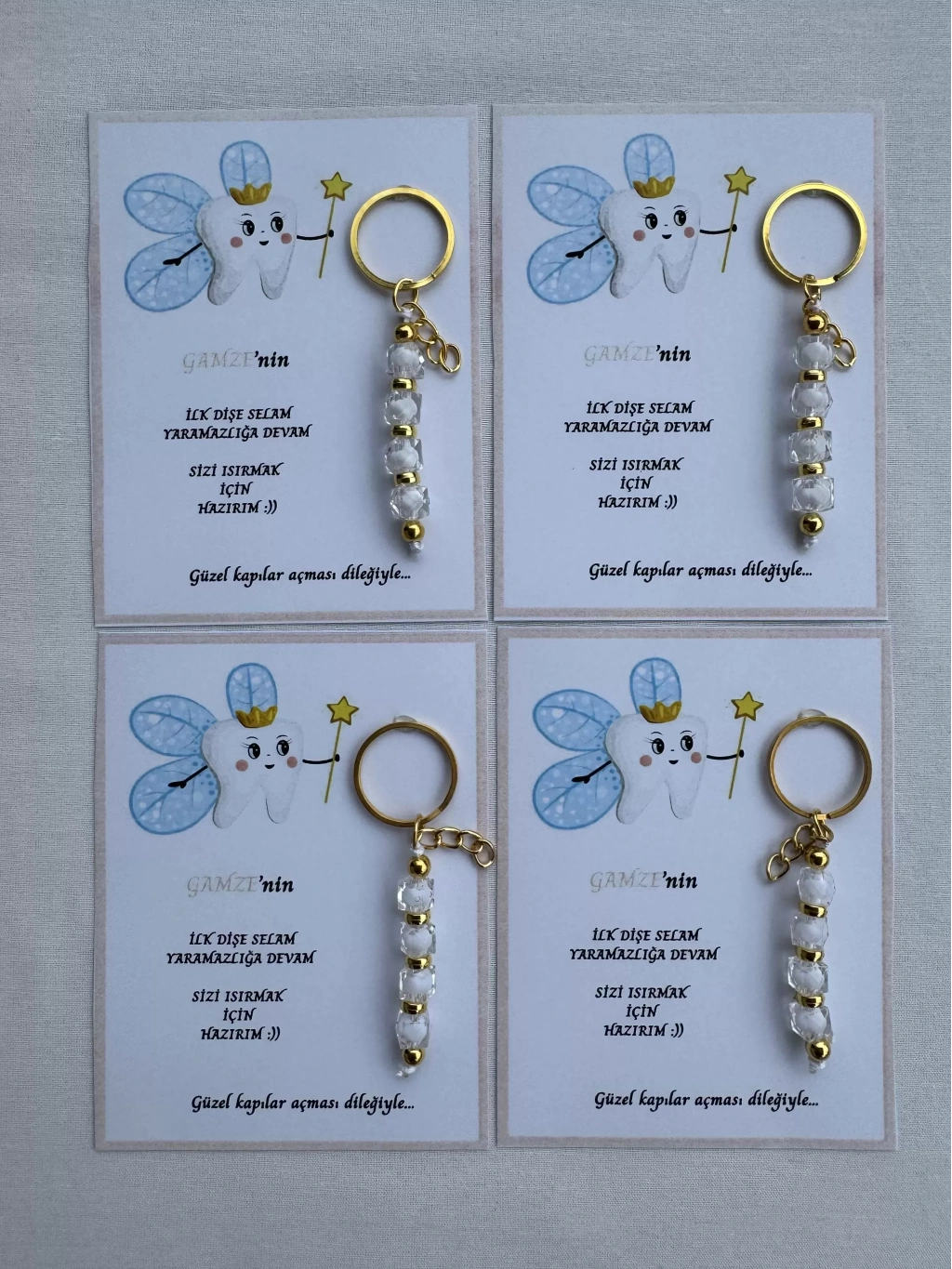 • 48 Adet Beyaz Renk İsme Özel İlk Dişim Çıktı Diş Partisi Diş Buğdayı Hatırası Hediyelik Anahtarlık