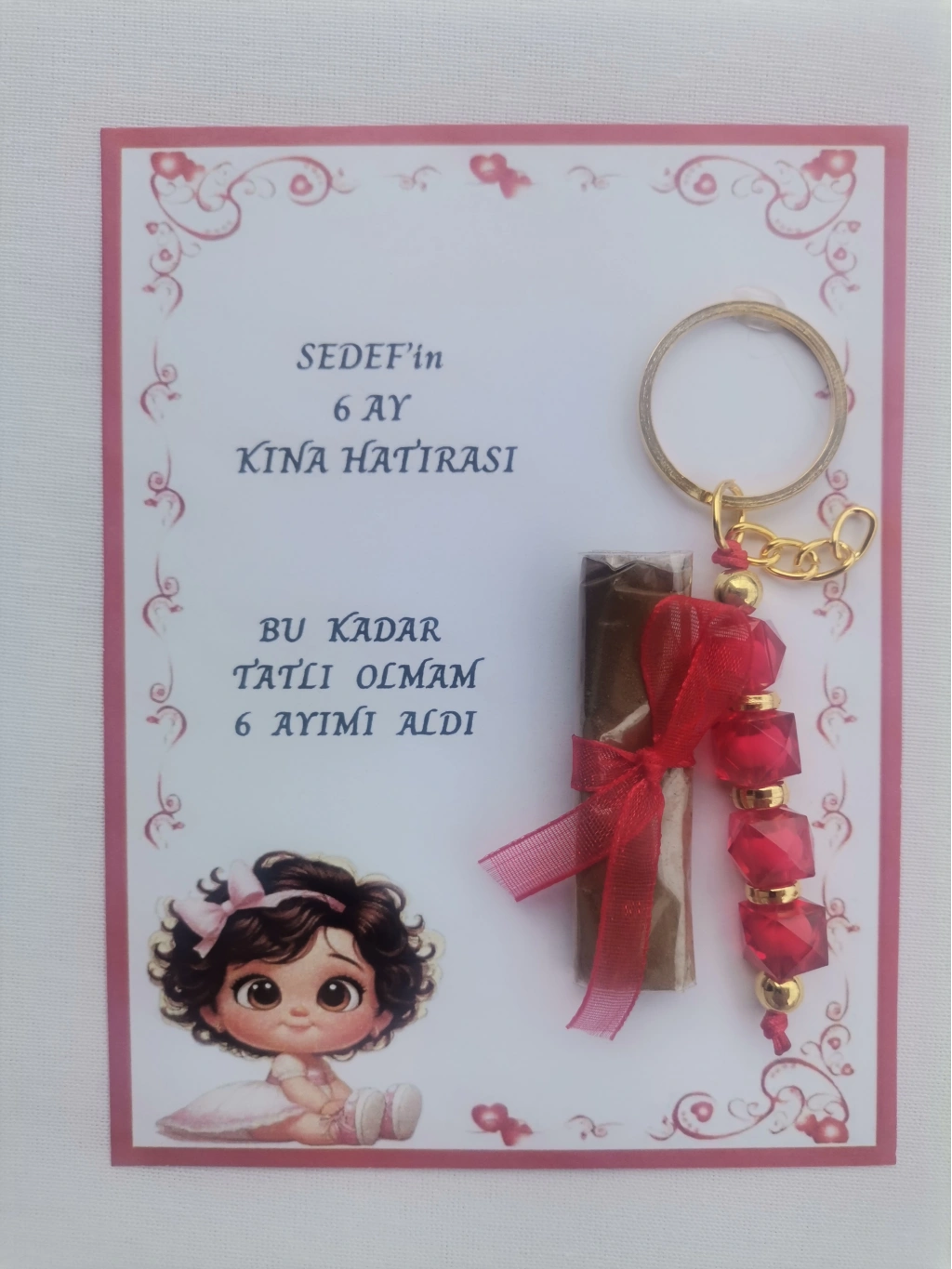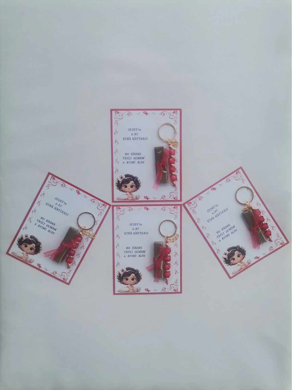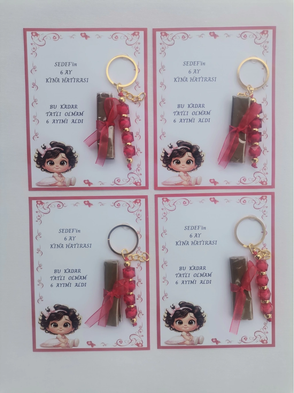 Her bir anahtarlık, kırmızı renkli tasarımıyla dikkat çeker ve 6 ay kınasının şıklığını tamamlar.