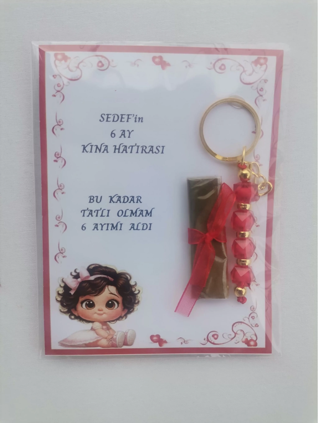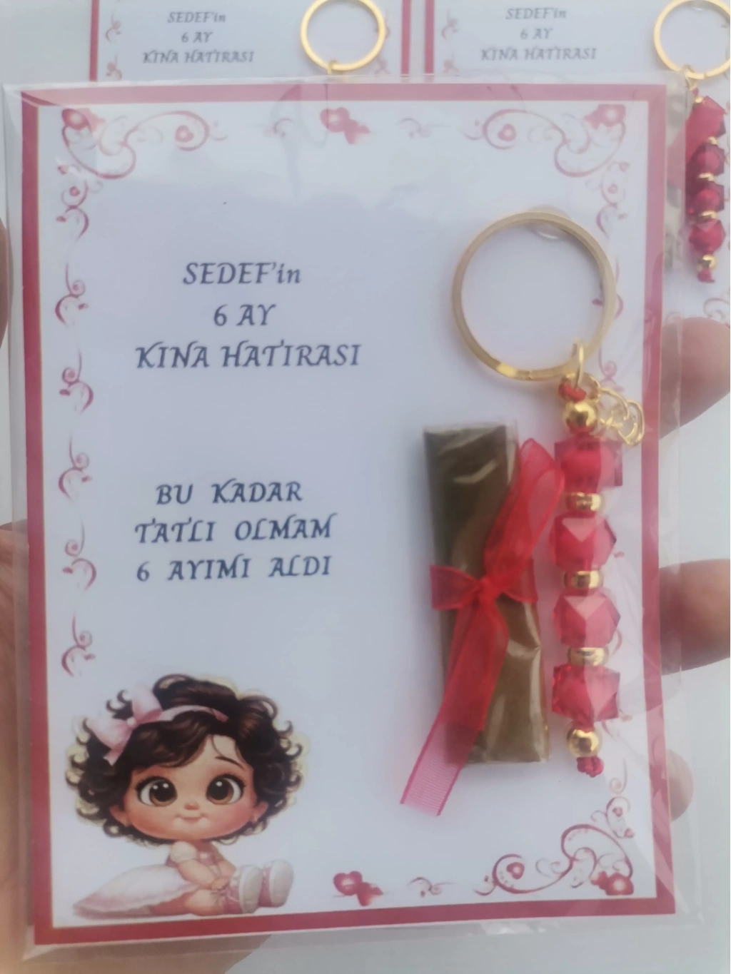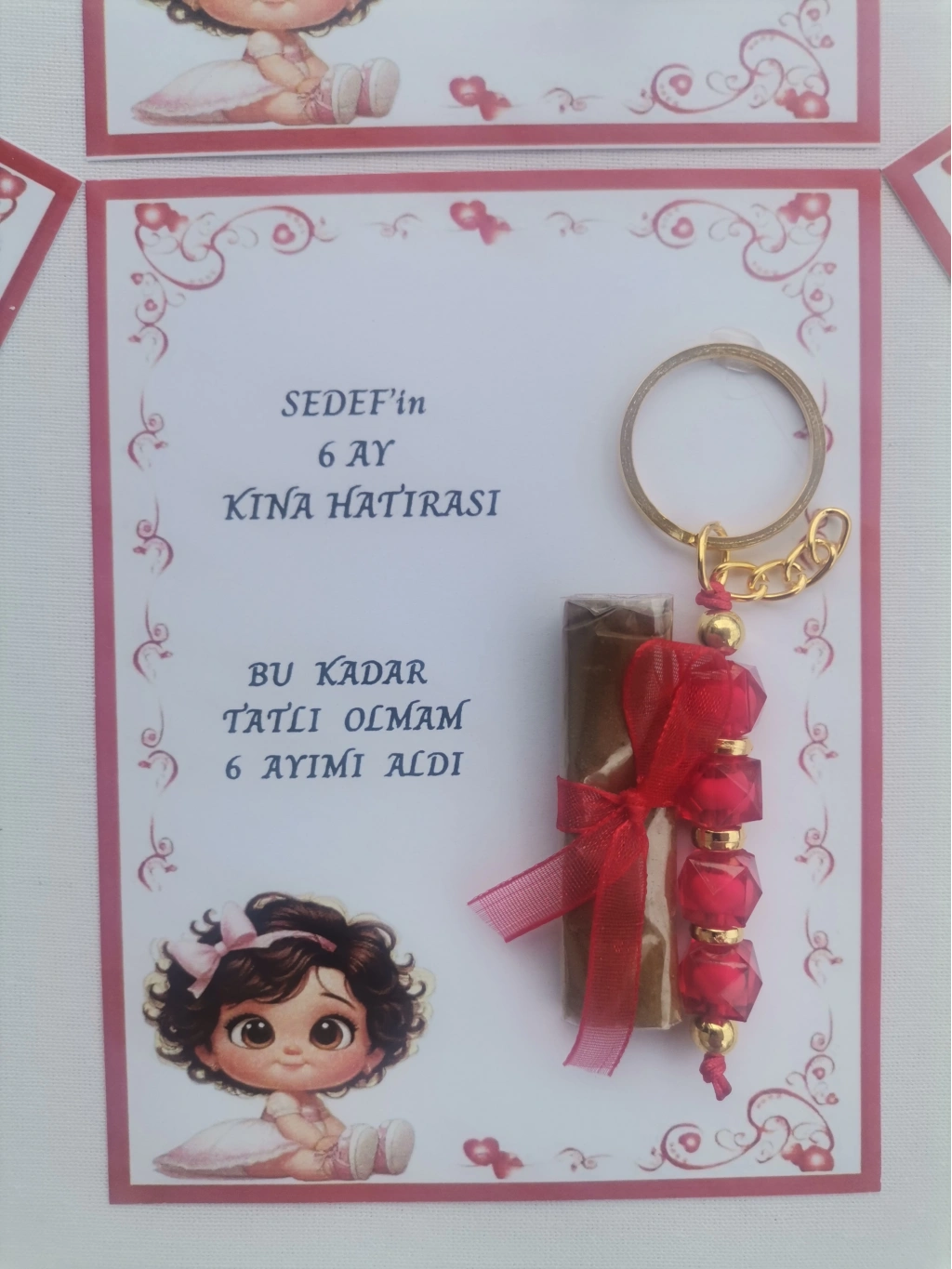 Her bir anahtarlık, kırmızı renkli tasarımıyla dikkat çeker ve 6 ay kınasının şıklığını tamamlar.