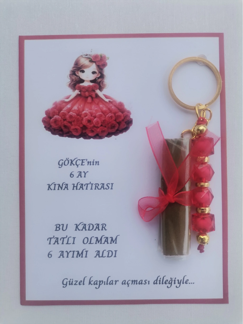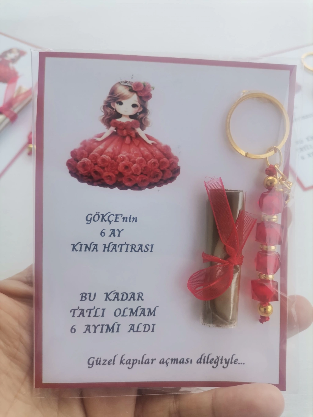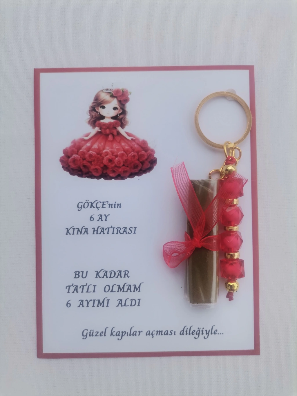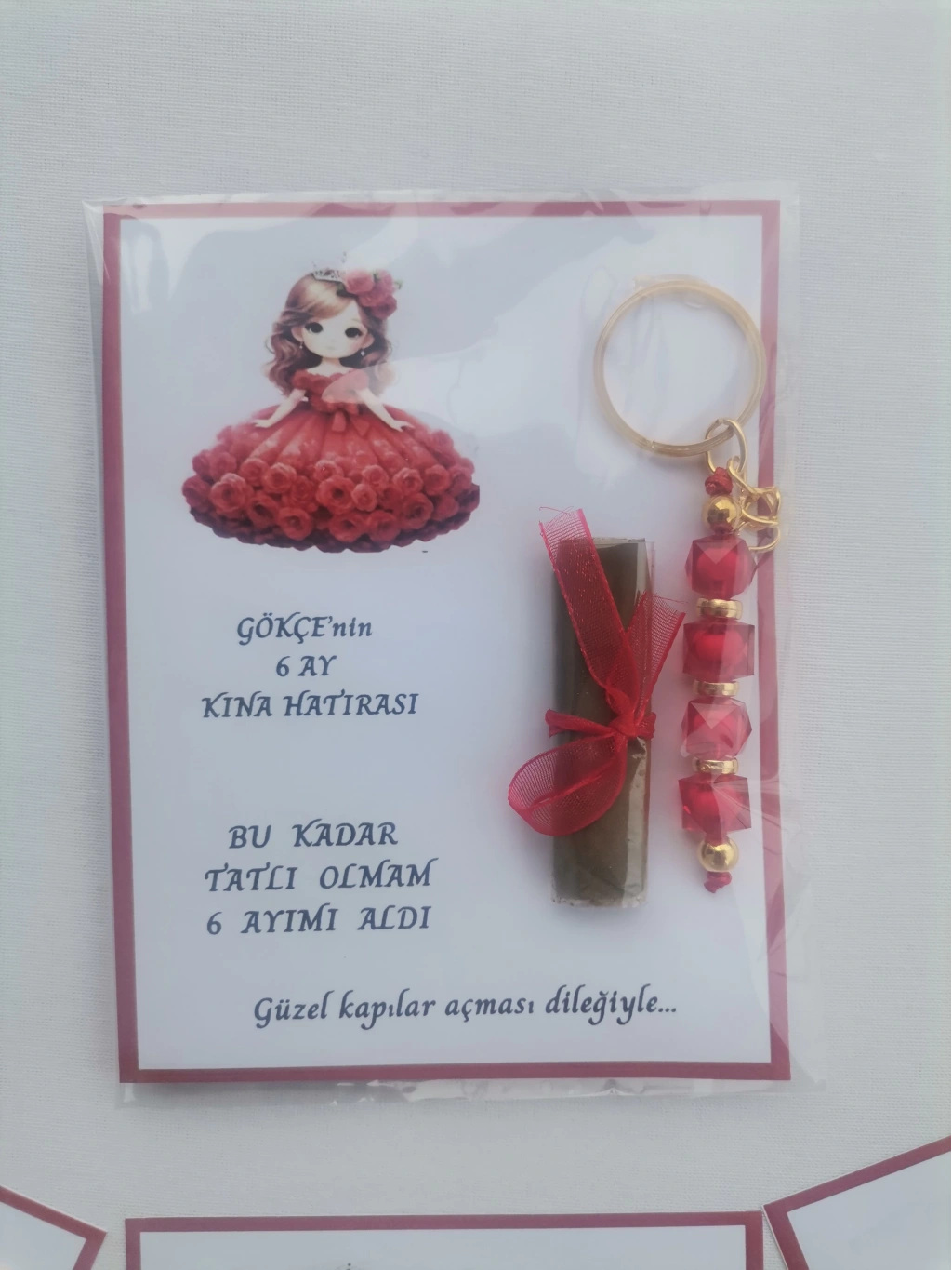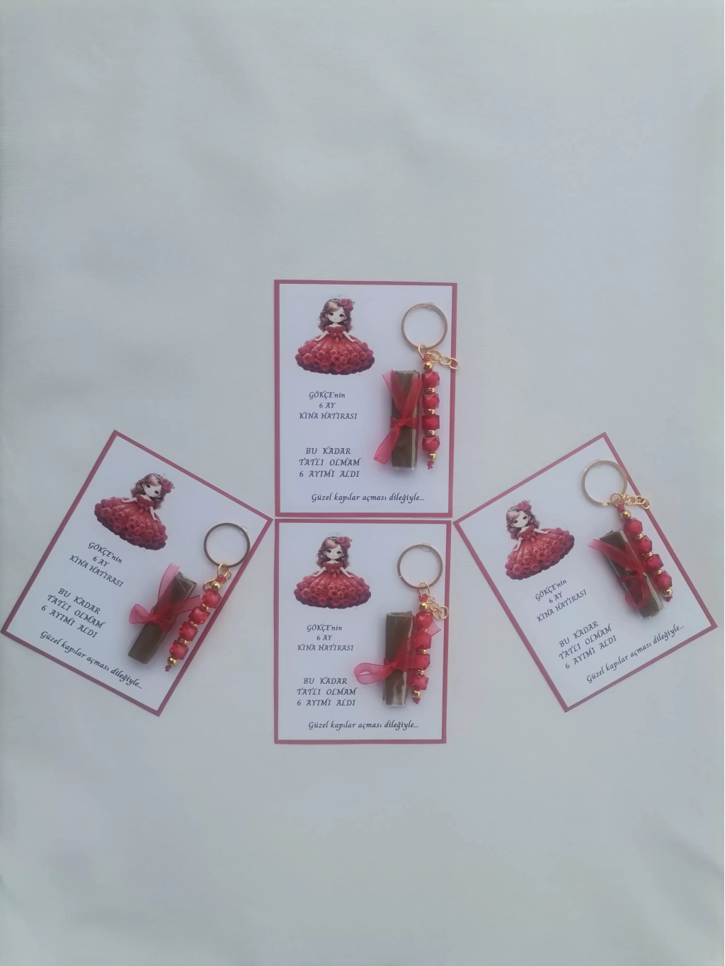 Her bir anahtarlık, kırmızı renkli tasarımıyla dikkat çeker ve 6 ay kınasının şıklığını tamamlar.