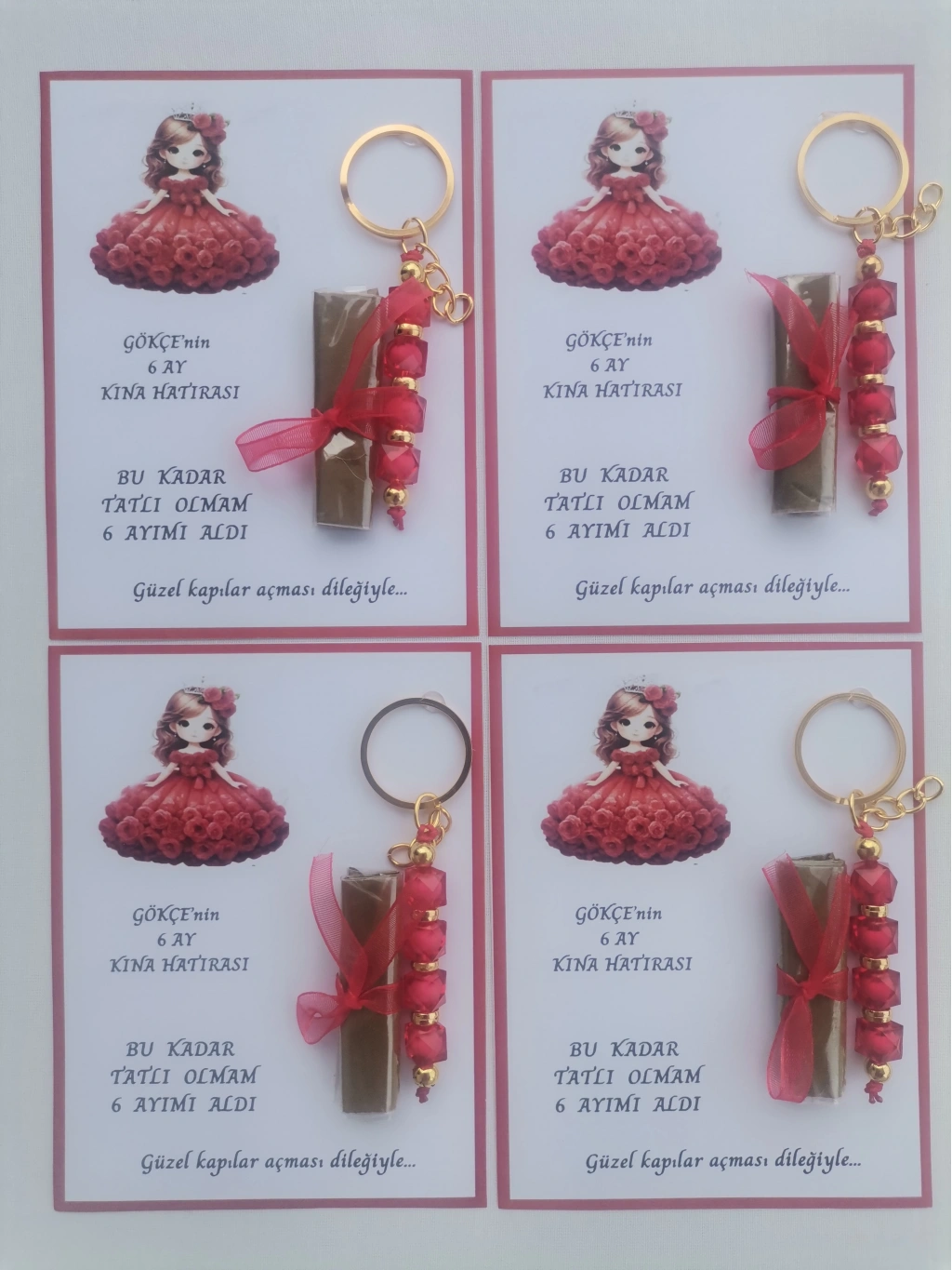 Kişisel dokunuşunuzu yansıtan 64 adet kişiye özel 6 ay kına hatırası anahtarlık, sevdiklerinize unutulmaz anılar bırakmanızı sağlar.