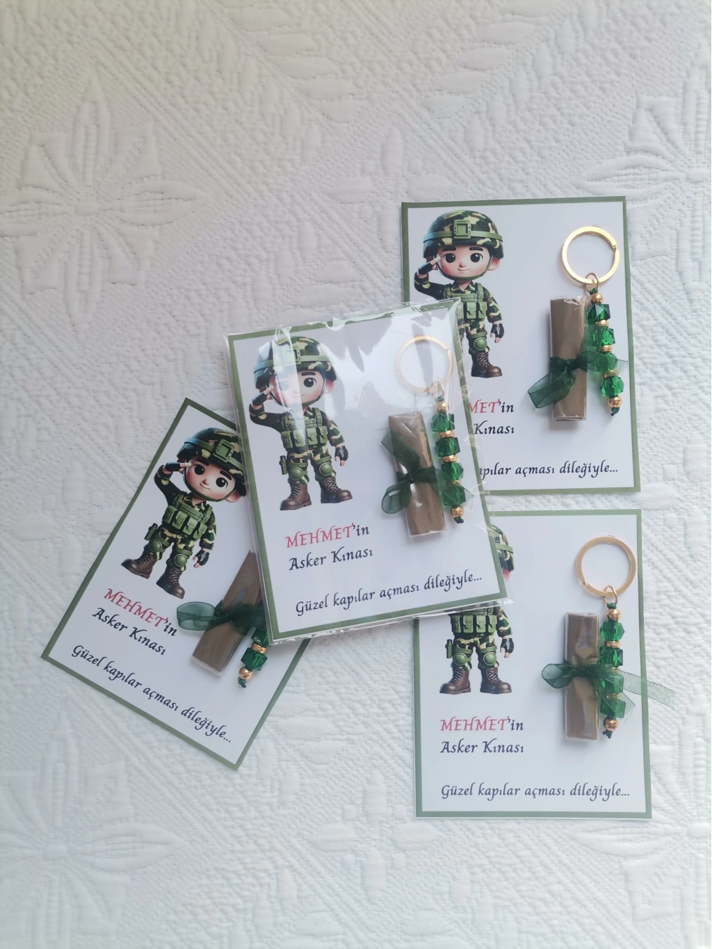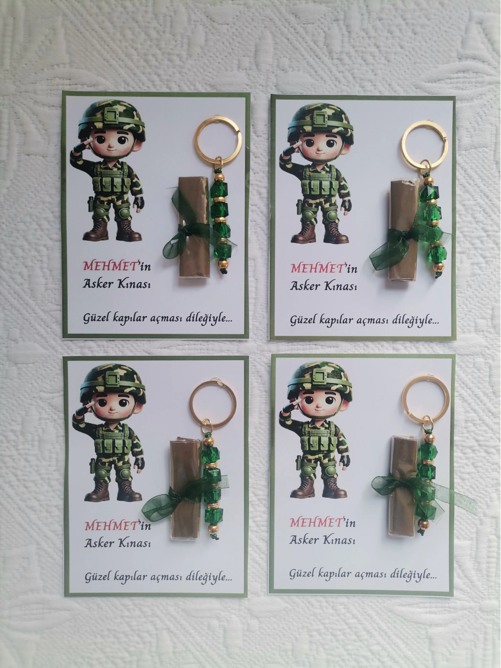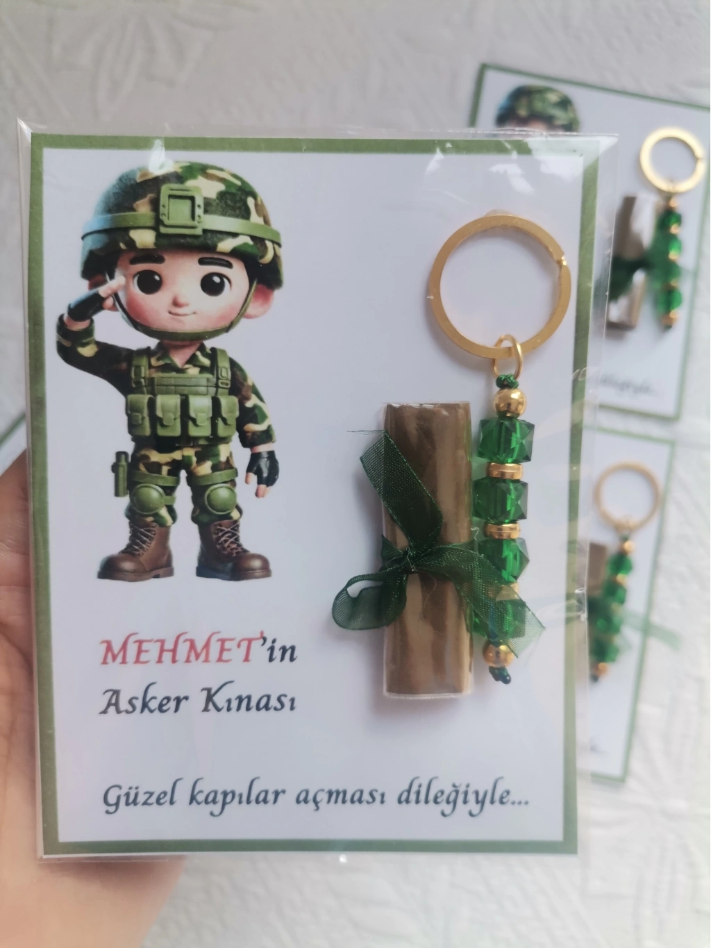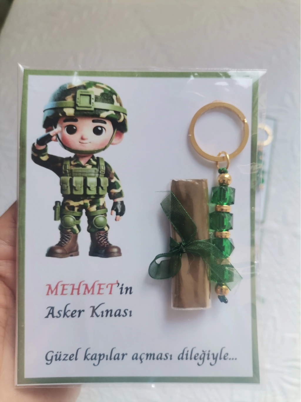 - Kişiye özel olarak hazırlanan bu anahtarlıklar, asker kına hatırası olarak dağıtılabilir ve özel gününüzde sevdiklerinize unutulmaz bir hediye sunar. -