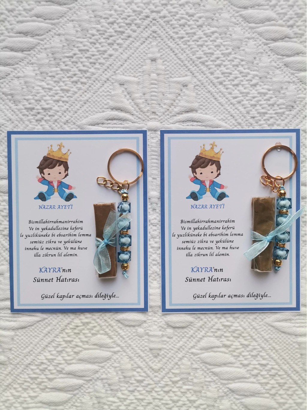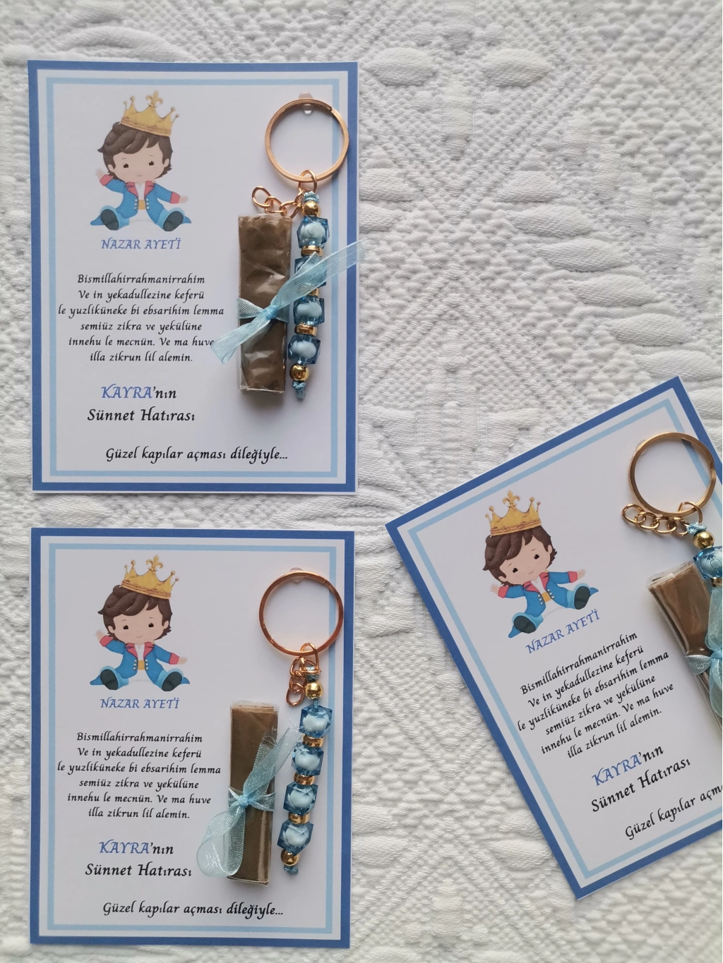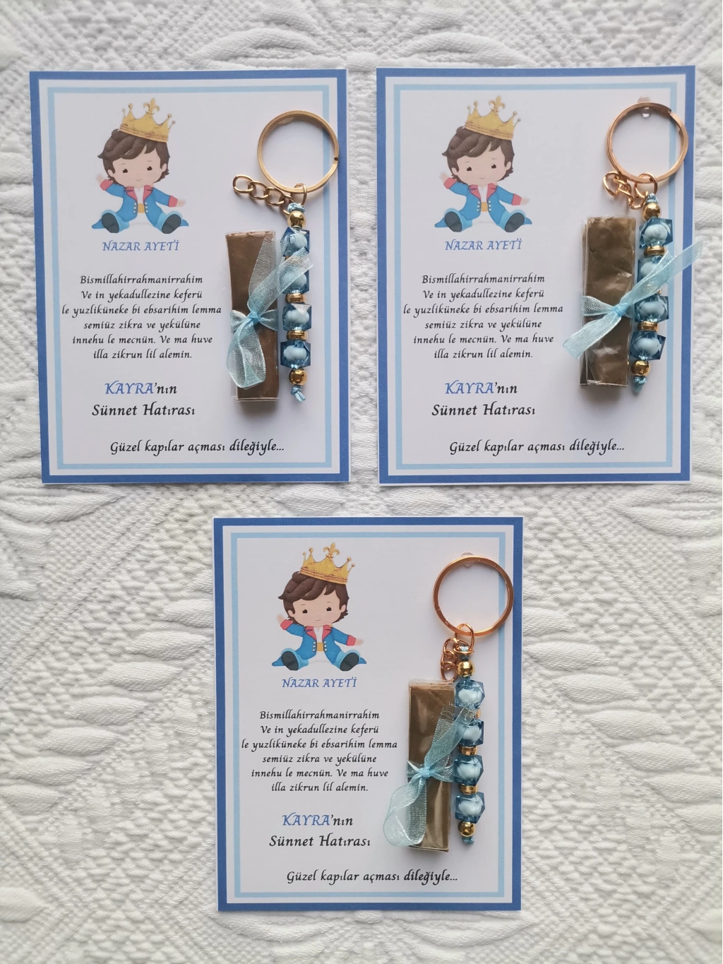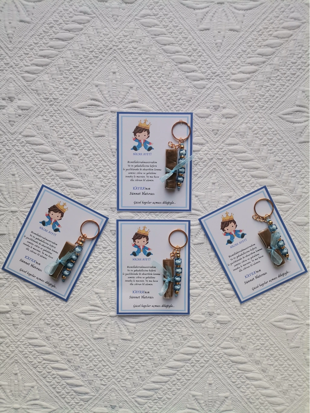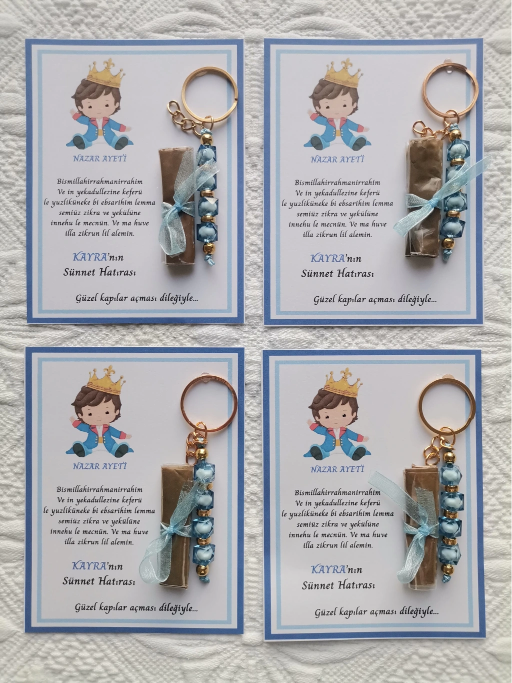 64 Adet Kişiye Özel Nazar Ayeti Sünnet Hatırası Mavi Anahtarlık ve Kına Dağıtmalık Hediyelik