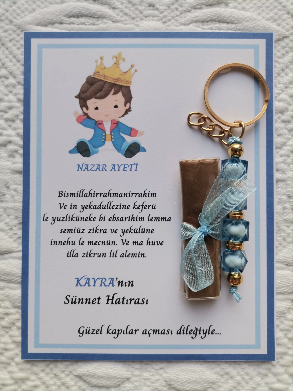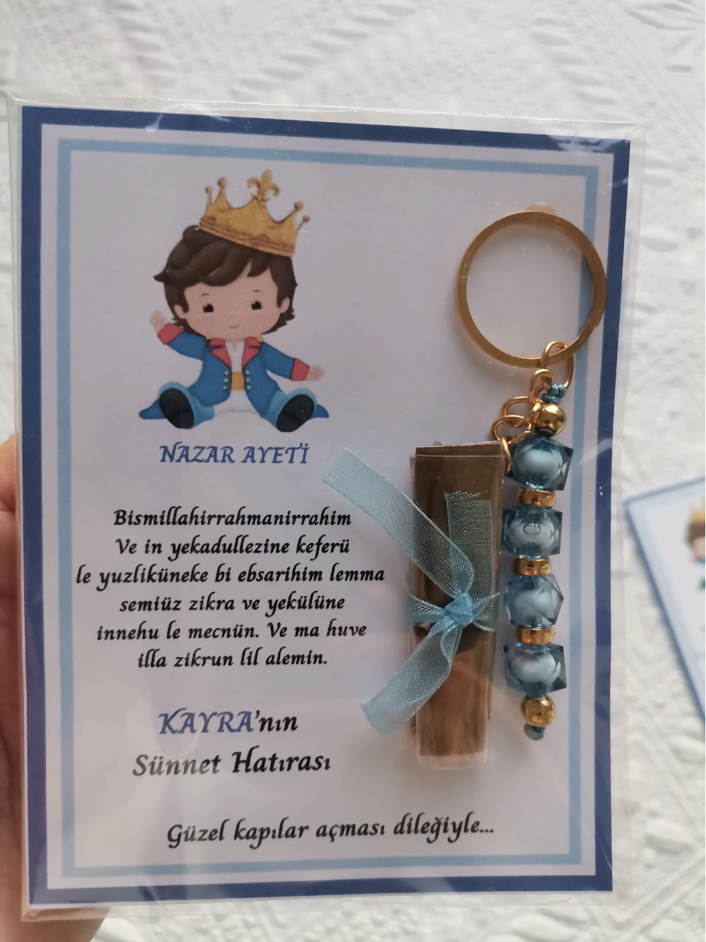 Kişiye özel nazar ayeti ile süslenmiş, her bir anahtarlıkta özel bir dokunuş var. -