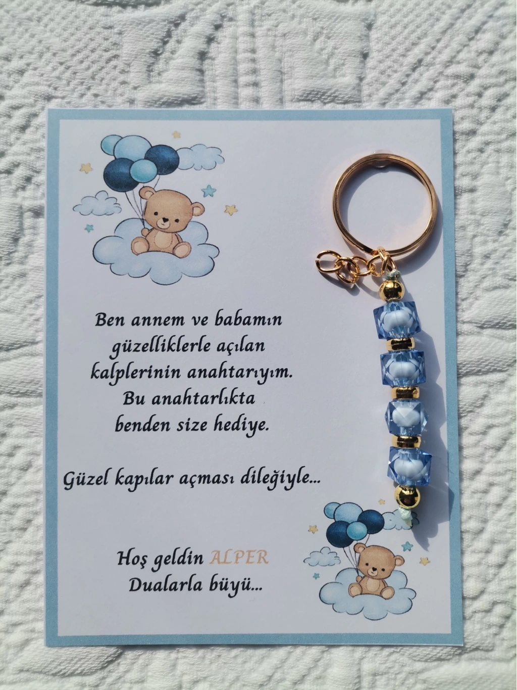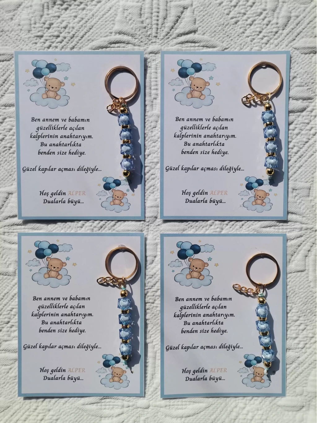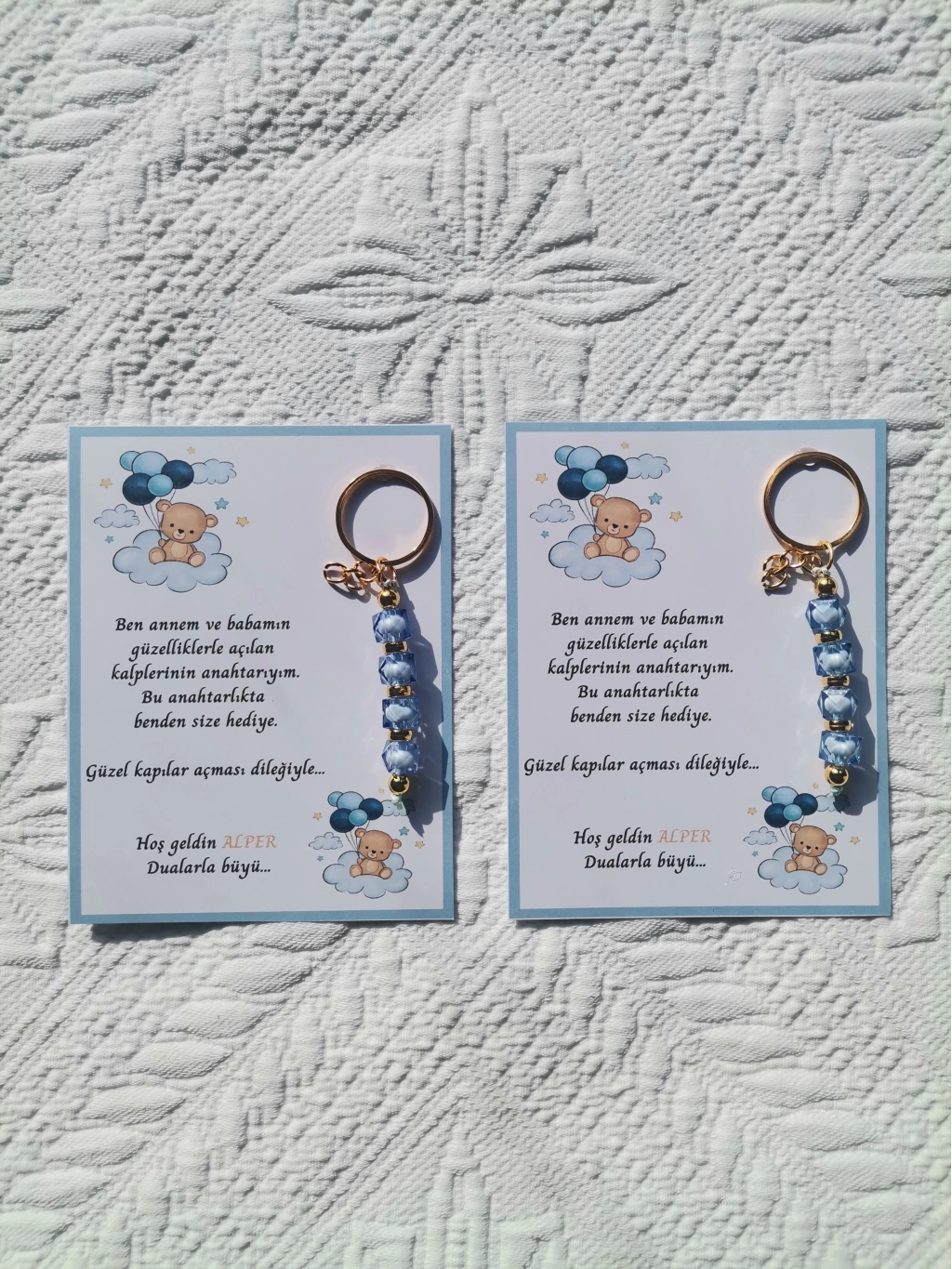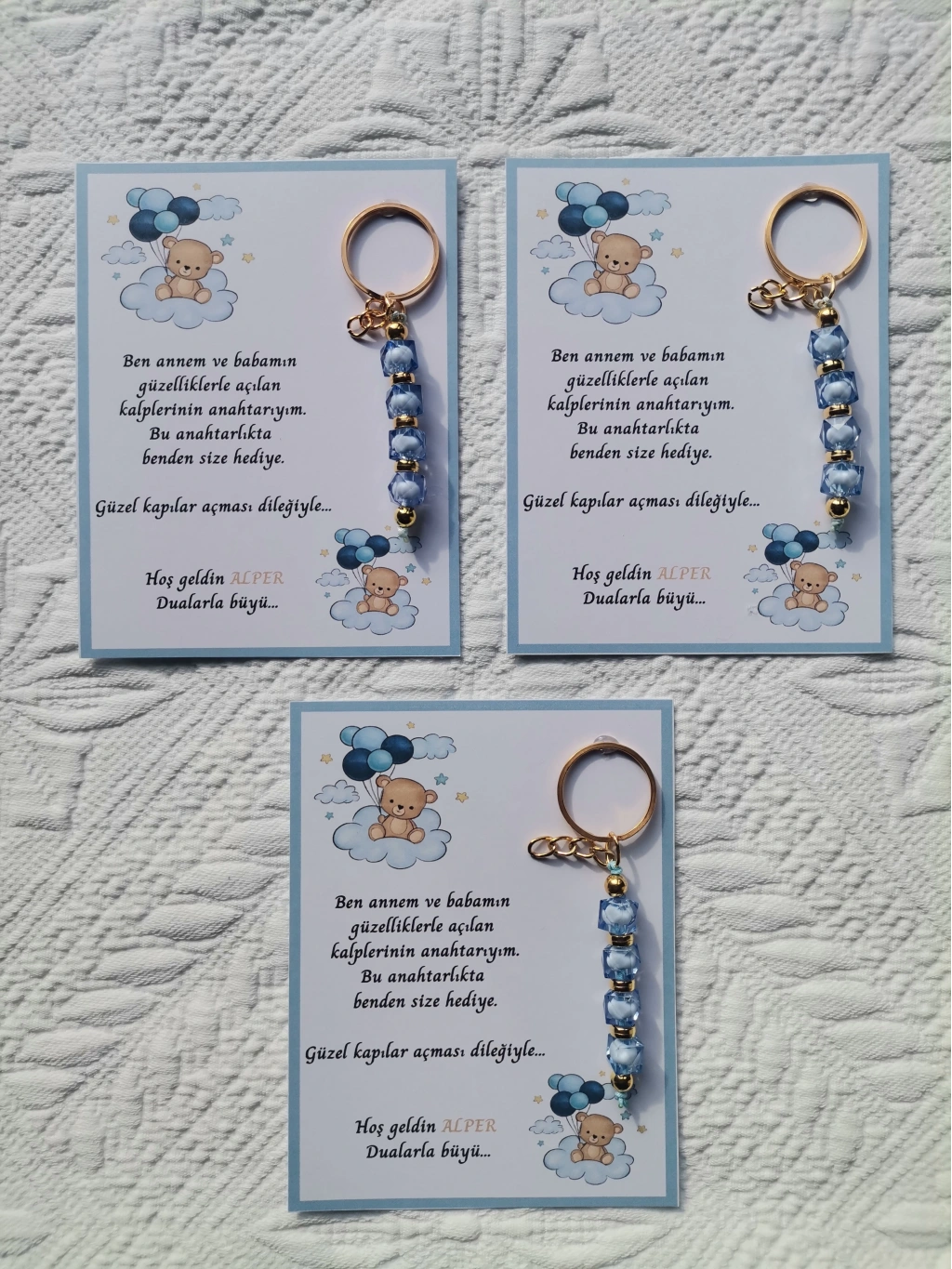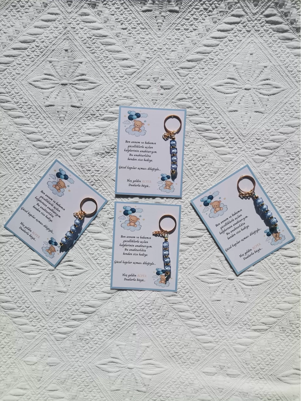 72 adet MAVİ anahtarlık, dualarla büyülü mesajlarla süslenmiş, hastane ve yeni doğan bebeklerinize özel olarak tasarlanmıştır.