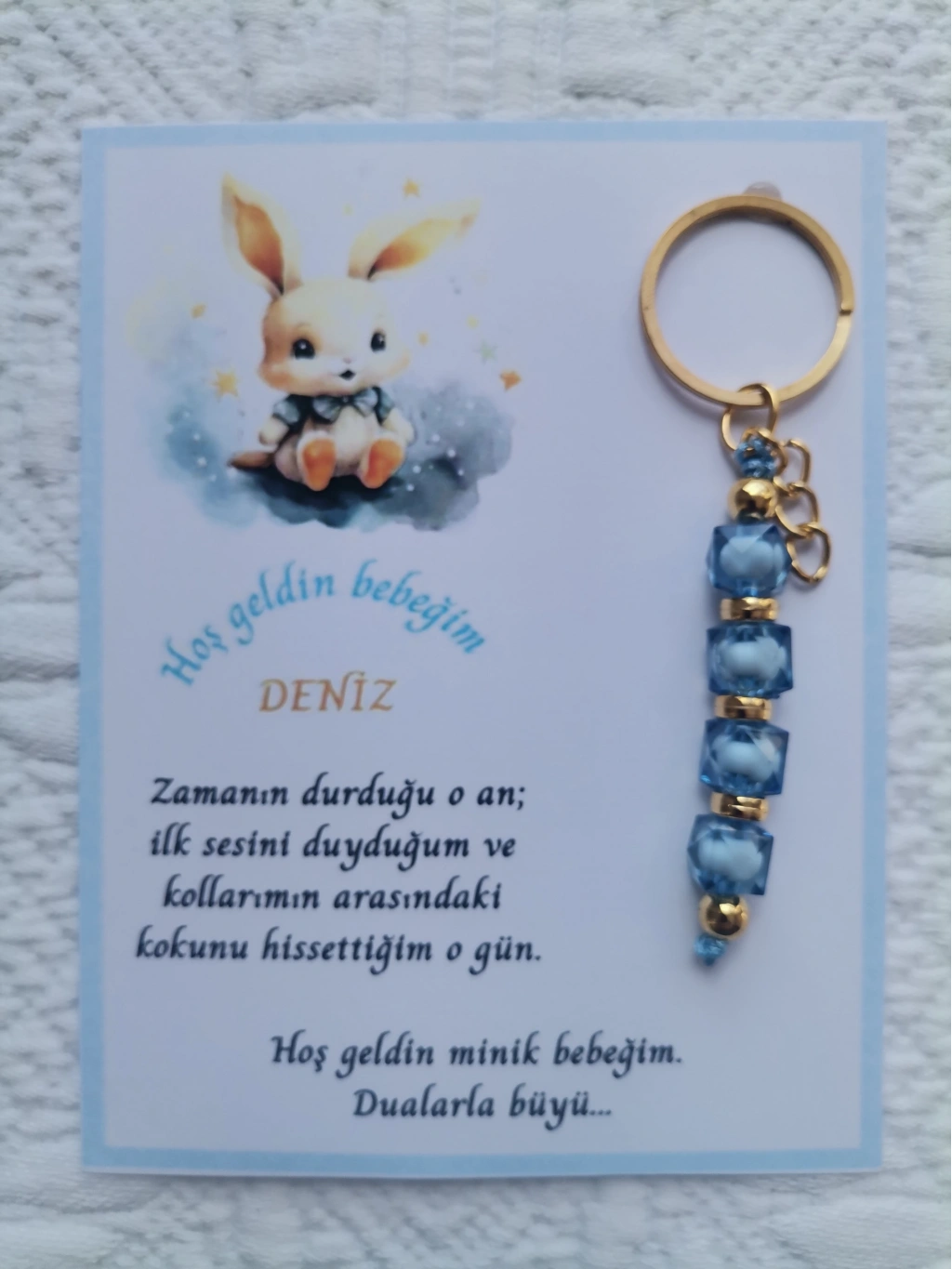72 adet MAVİ anahtarlık, dualarla büyülü mesajlarla süslenmiş, hastane ve yeni doğan bebeklerinize özel olarak tasarlanmıştır.
